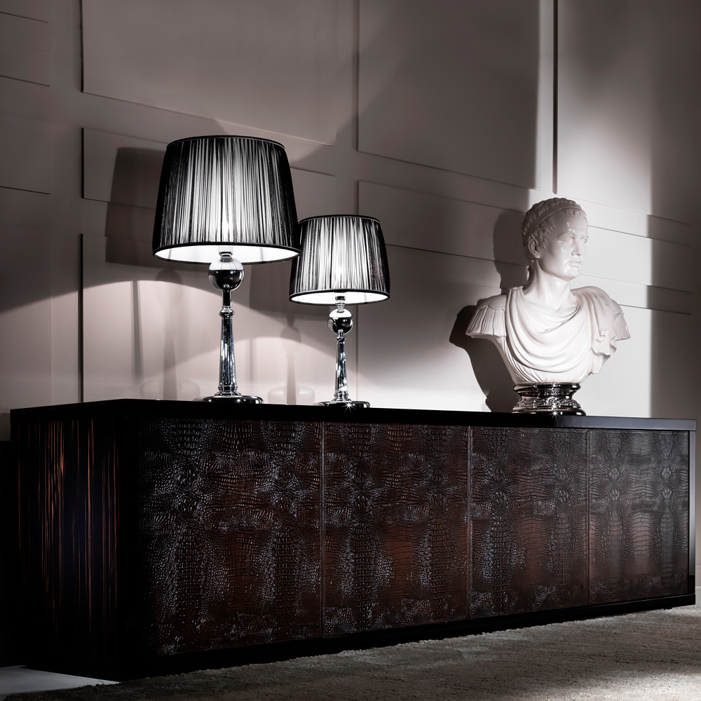 The Embossed Leather Veneered Buffet Sideboard is a truly stunning statement for any room in the house. Striking in any setting, the ultimate in a stylish and glamorous storage solution. As comfortable in a dining room, bedroom or study as it is as a welcome in an entrance hallway. A solid beech wooden structure based on minimal clean lines, with the most fabulous ebony Macassar veneer finish to the structure, completed with a simple stainless steel plinth style base.