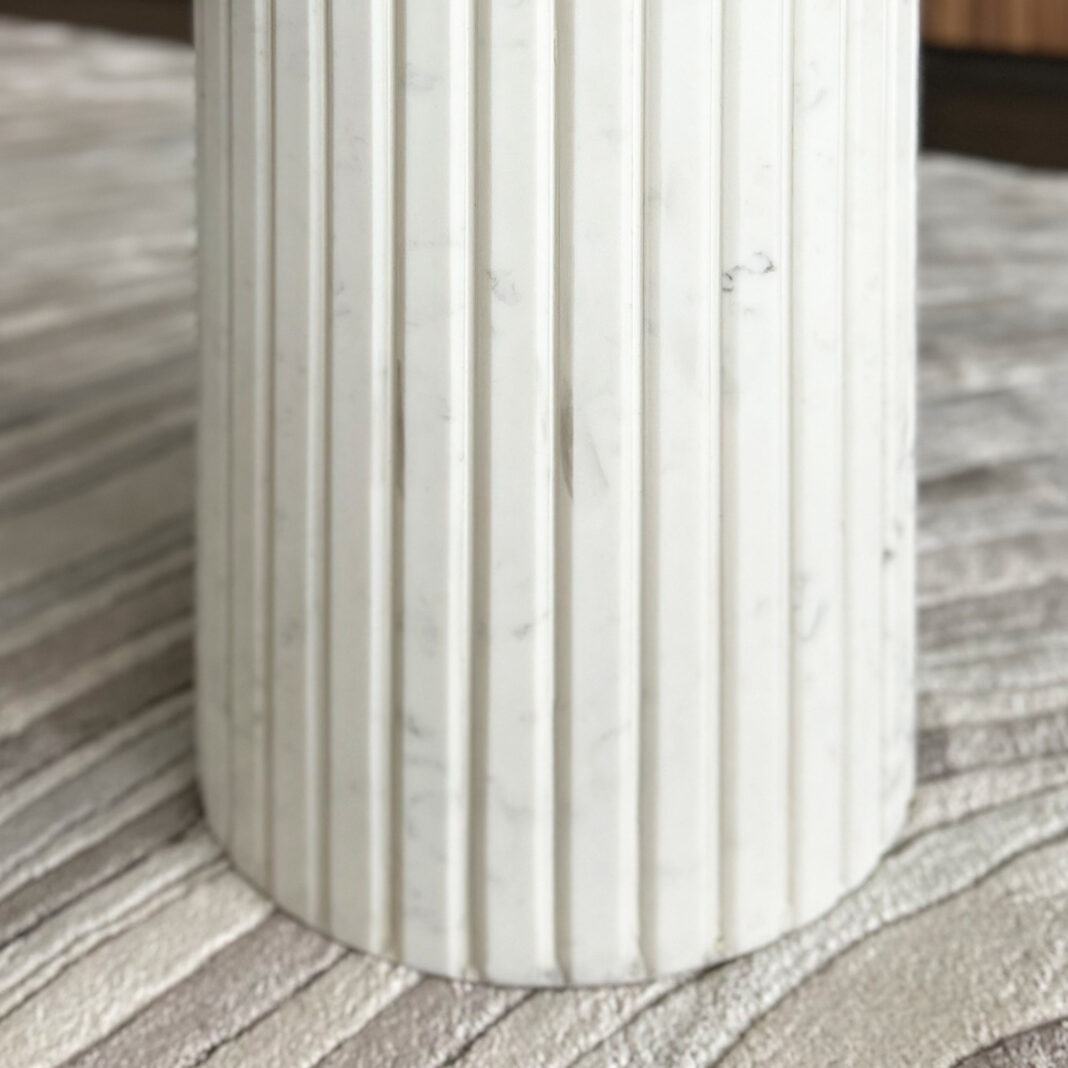 Balanced by design, produced by hand and finished to an exceptional standard in a white Ammonite Tuscany Quartz renowned for its elegant veining pattern and luxurious appeal. A beautiful round bronze ripple glass top is supported by striking double pedestal bases. The two bases, each with Art Deco-inspired tones, are strikingly different and create a captivating focal point: one is smooth and rectangular, while the other is round and ribbed. A beautifully contrasting combination. Available in various other sizes, marbles, faux marbles and glass styles. Prices will vary.