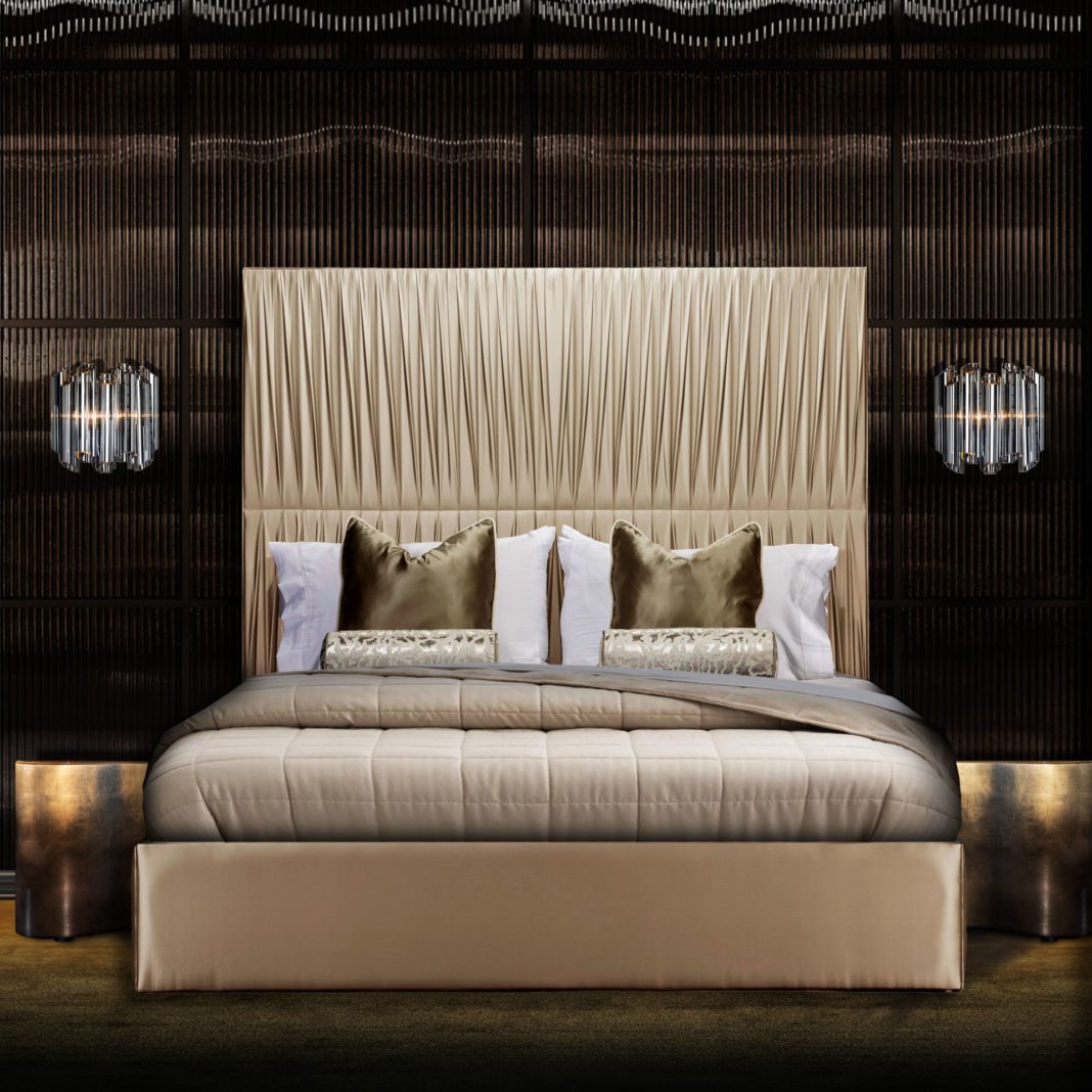The Exclusive Bed With Tall Satin Pleated Headboard is truly striking, original and exquisitely current. A statement bed that would suit any bedroom interior, adding the utmost in style. Stimulate the senses and create a seductive atmosphere with this luxuriously elegant design of refined Art Deco inspiration and fine detail. Truly timeless, a statement of superb quality. Altogether providing a unique focus for a variety of situations, adding a sumptuous touch for any boudoir! A special and unique piece.