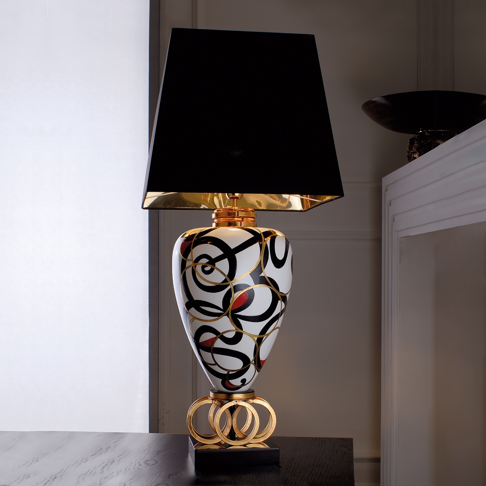 This striking table lamp offers a handcrafted patterned design beautifully realised. Featuring a black and white glazed Majolica base with a dash of red, together with hand decorated gold-plated details. Gold-plated hand forged iron rings provide a unique feature and rest on a solid wood black lacquered plinth. Complete with a luxury black chintz lampshade with gold lining. Altogether providing a luxurious ambience, and a perfectly unique element to your interior design.
