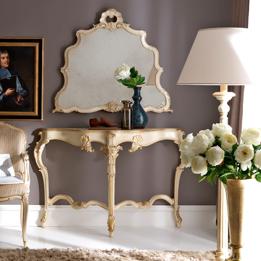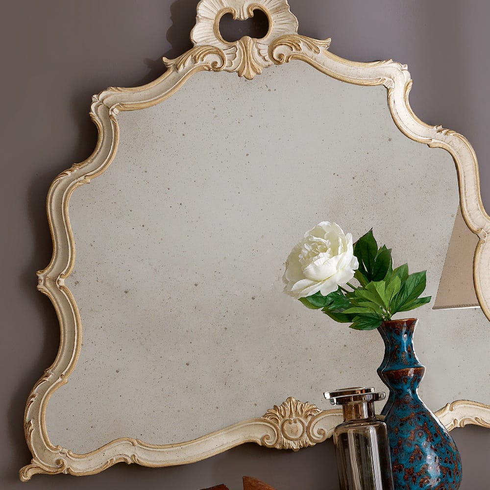 Made wholly in wood and distinguished in every detail by the hands of artisans. This uniquely shaped antiqued glass wall mirror features an antique white finish with gold and brown tone detailing and the most elegant of hand painted botanical elements, creating a display of brilliance. Height 97 cm x width 100 cm. Feature with the co-ordinating wall mounted console table for an outstanding focus in the same striking finish. Also available to order in different colours, sizes and finishes by request. Prices will vary.