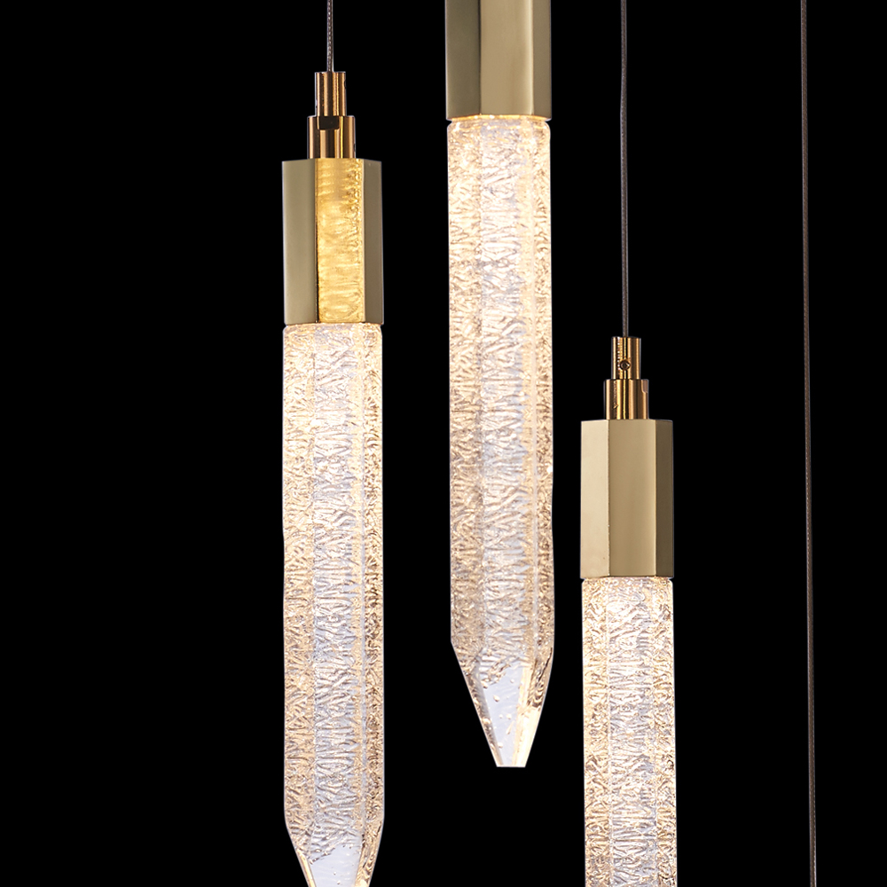 Supported by a sturdy ceiling rose in a suave gold finish, this pendant light is showcased by seven ice glass elements which combine to create a fully illuminating effect. Features integrated LED lighting. Also available in alternative sizes and in a chrome finish. Prices will vary.