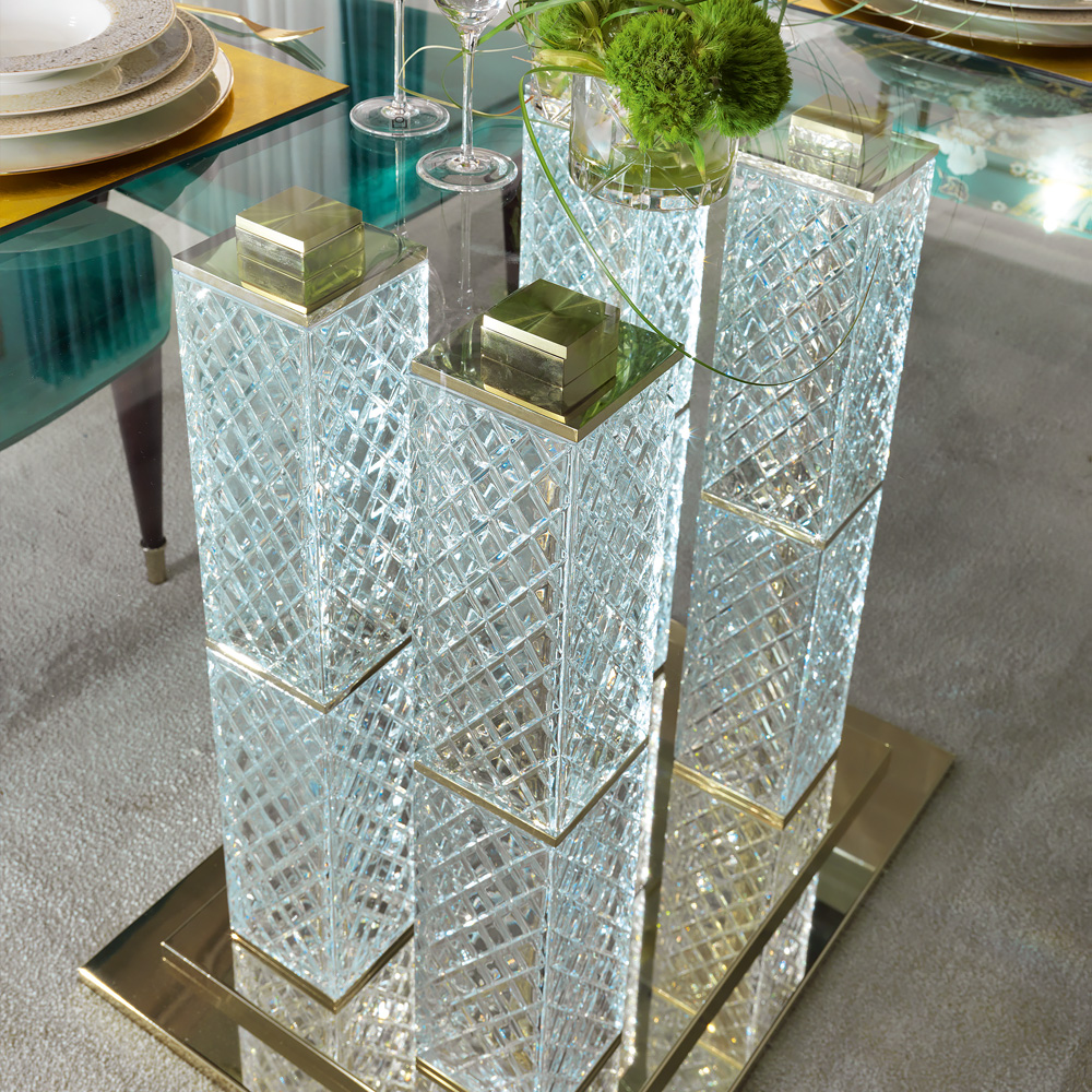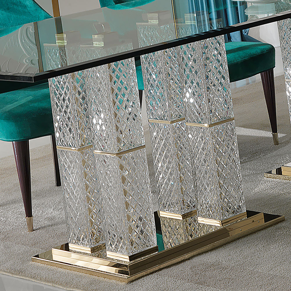 The stunning contemporary styling of the rectangular bevelled tempered glass table top is of the highest standard and works perfectly together with the statement double set of intricate cut glass plinth style bases. Supported by, and with enhancing detailing of brass and Inox steel with a vibrant gold plated finish. A perfect unity of forms indeed, maximising the minimal look. Height 76 cm x width 270 cm x depth 110 cm. Paired here in perfection with the Italian Designer Upholstered Dining Chair, a solid beech wooden structure in an ebony finish and upholstered to the highest standards in the finest quality ivory velvet or decorative fabric of oriental inspiration. Completed with refined metal glides and arm rest detailing in a brass finish. Height 87 cm x width 60 cm x depth 65 cm. The table is also available in customised sizes and finishes such as chrome, the dining chair is also offered in alternative fabrics and finishes, such as satin brass and alternative woods. Prices will vary.