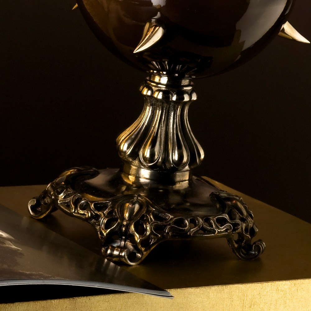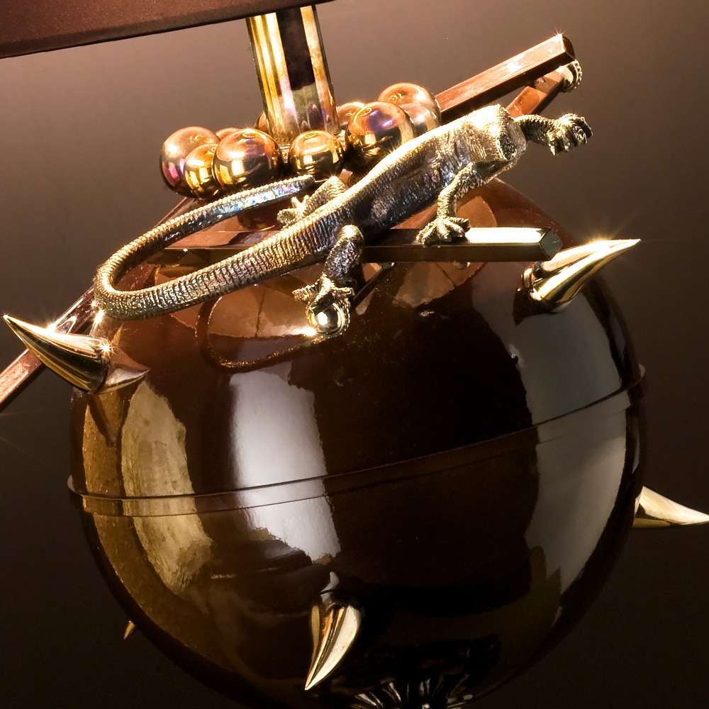 Create a unique statement with this sensational design. Focusing on a superb central feature which includes a brown lacquered sphere detailed with aged chrome ‘horns’, together with a scrambling chrome lizard over further aged chrome elements. Complete with a slender silk satin bronze lampshade and aged chrome detailed base.