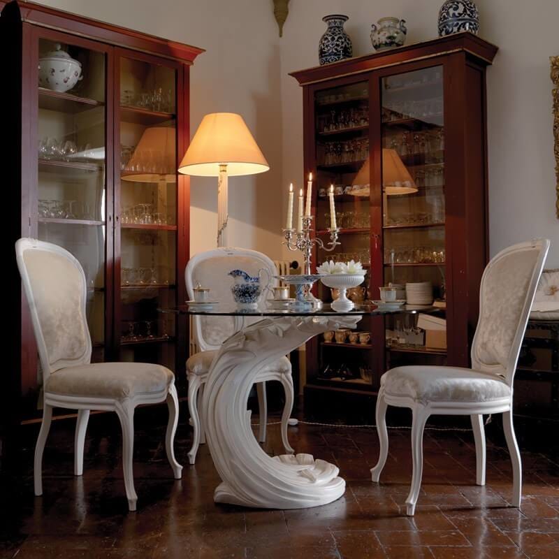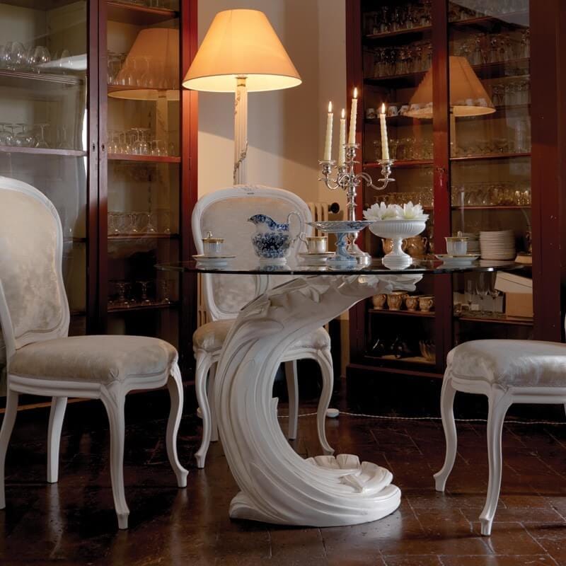 Presented as part of the Exclusive Italian Pedestal Round Glass Dining Table Set with beautiful precious stone detail to the leaves of the nature inspired unique central pedestal. Shown here in a matching antique white finish and round glass top. An eye catching statement piece for any room in the house. Also available to order in different colours, finishes and other sizes with two or three pedestals. Table, height 77 cm x diameter 120 cm.