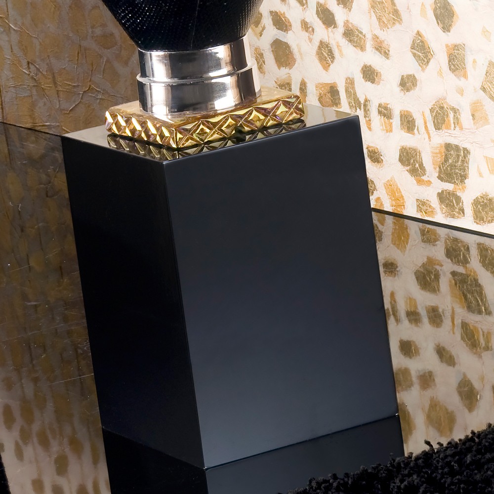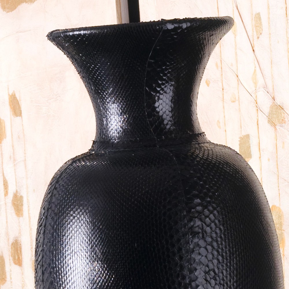 This fabulous vase offers a uniquely dramatic modern focus. Covered in glossy black snakeskin, and resting on a black lacquered wood and hand carved gilded crystal plinth. Other details in chromed brass. Not suitable for holding water.