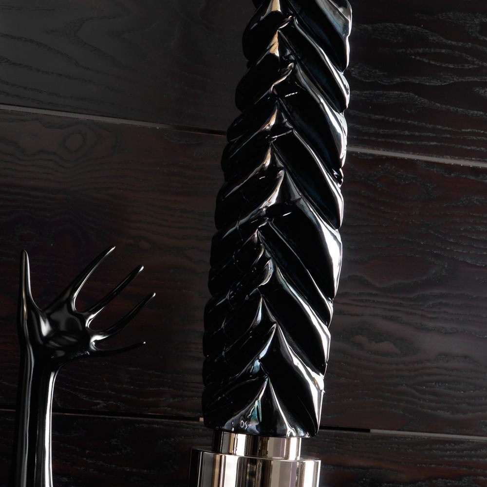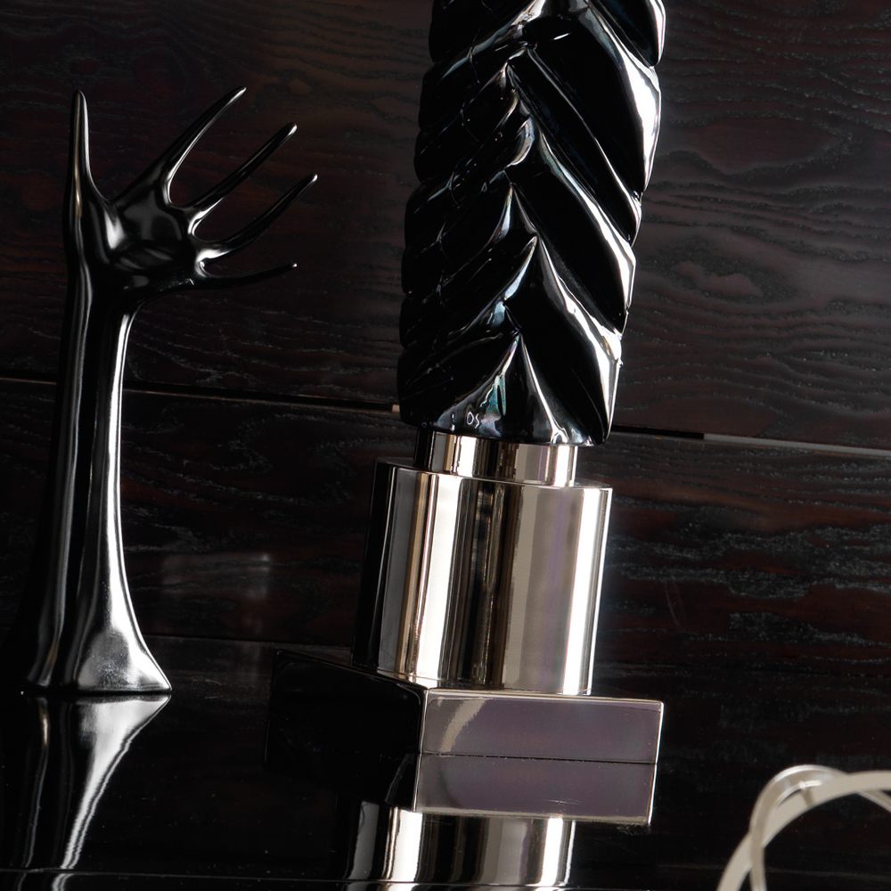 This fabulous design offers a uniquely elegant modern focus. Featuring a black glazed Majolica column together with a chromed brass base and details. Complete with a modern silk satin blue lampshade, with a silver band. Altogether providing a luxurious focus to your interior lighting decor.