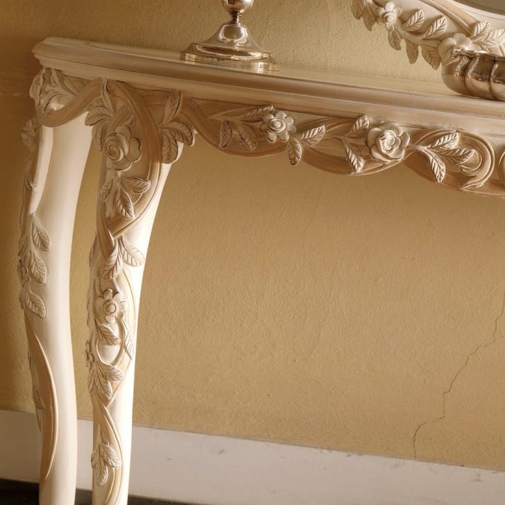 The Exclusive Italian Ivory and Gold Console Table is the most striking of additions to any setting. Offering a glamorous, welcome and focus. Shown here in an antique ivory finish with delicate bleached gold hand painted detailing, completed with a wooden top. Height 90 cm x width 132 cm x depth 52 cm. Also available to order in different colours and finishes, with a marble top or the addition of a protective tempered glass top by request. Prices will vary.