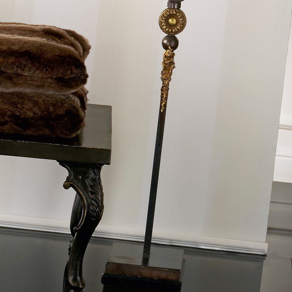 This design is certainly no exception and features a pewter stand and decoration together with Romanesque style bronze gilded details. Complete with a luxury grey silk taffeta lampshade which is mauve when the light is on. Altogether providing a fabulously luxurious atmosphere.