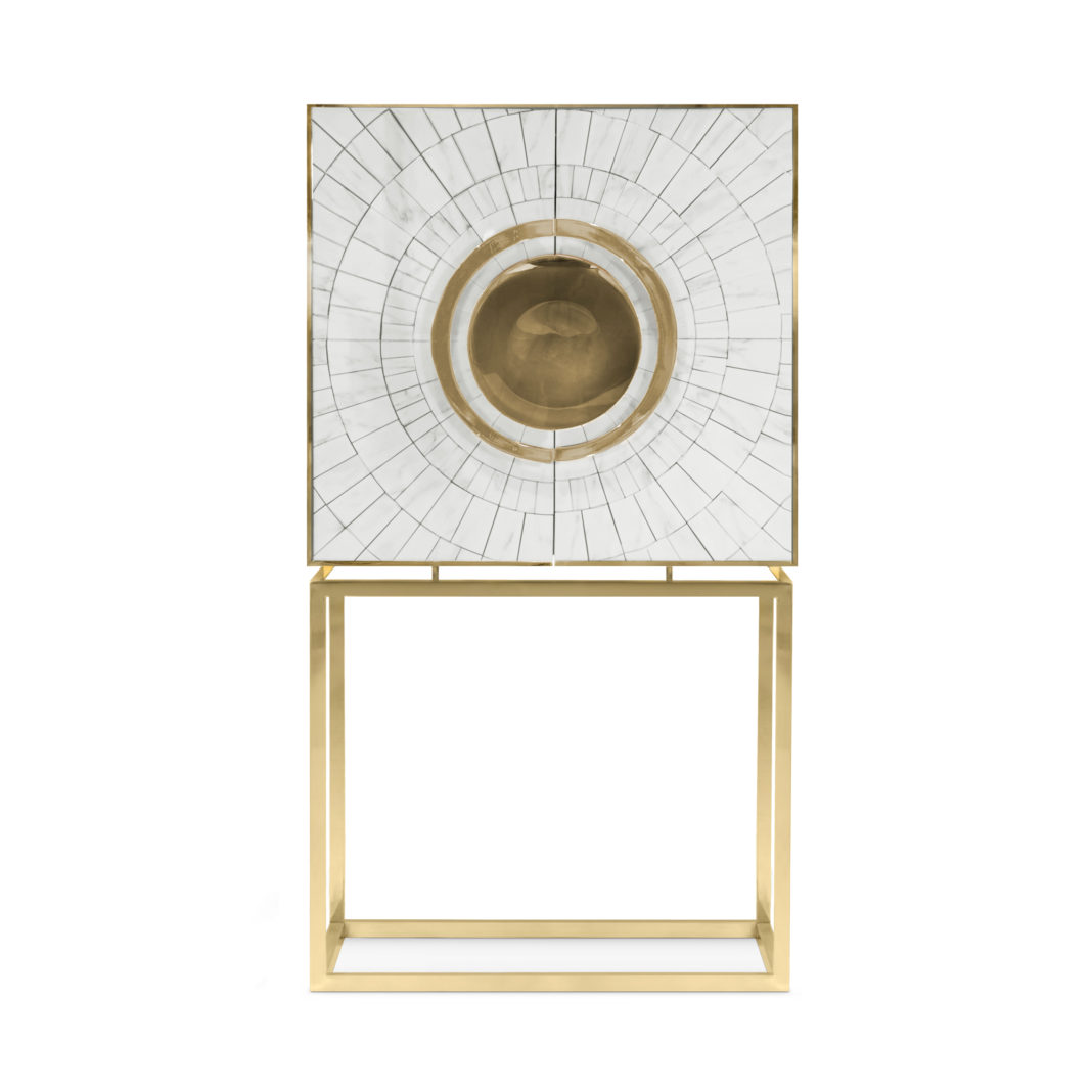 Striking in its dimensions and superbly executed by master craftsmen this fabulous cabinet is outstanding in its use of luxury materials and attention to detail. Designed in a minimal contemporary style making its beautiful radial arrangement of individual marble pieces based around it central motif and handle design its defining aspect. Supported by a fabulous metal frame structure in a vibrant brass finish. The internal configuration provides the the perfect storage solution with no compromise on beauty and attention to detail. The hand finished gold leaf lining, glass shelves and drawer detailing completes this cabinet to perfection. Alternative colours, finishes and special sizes are also available by request. Prices will vary.