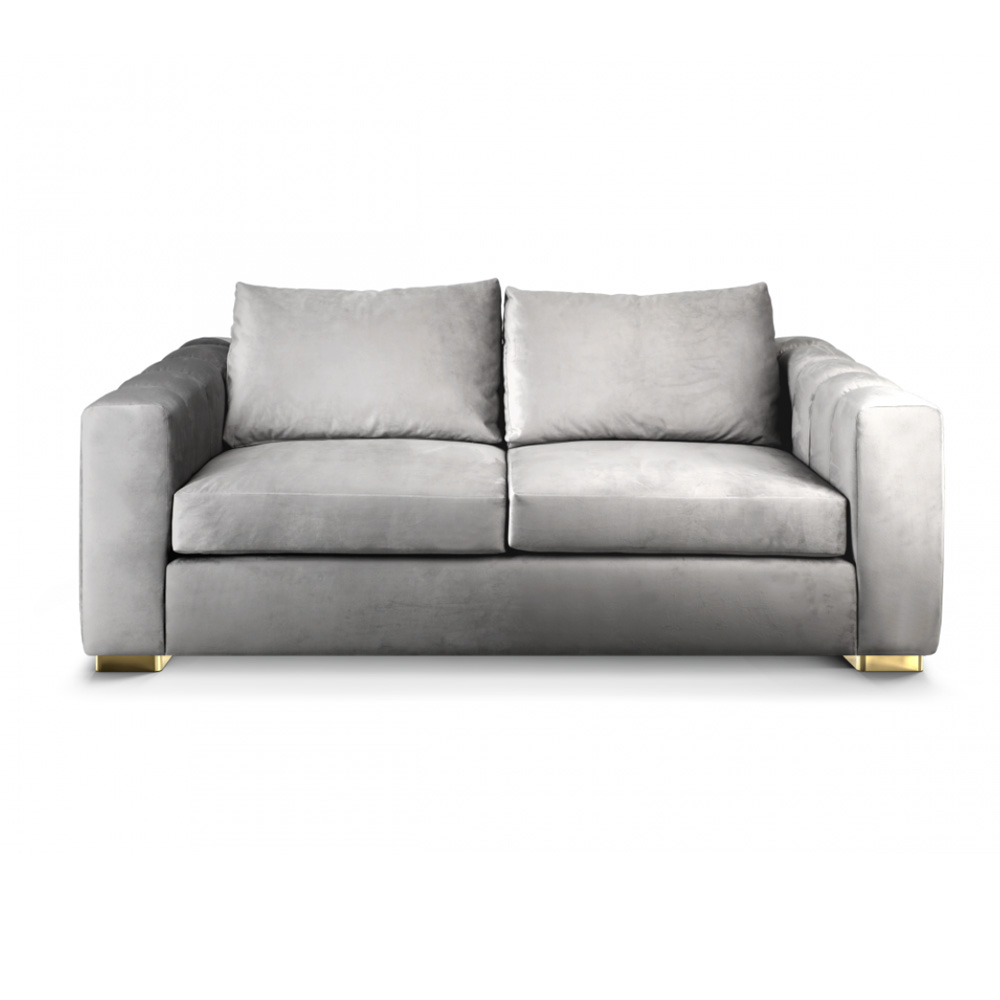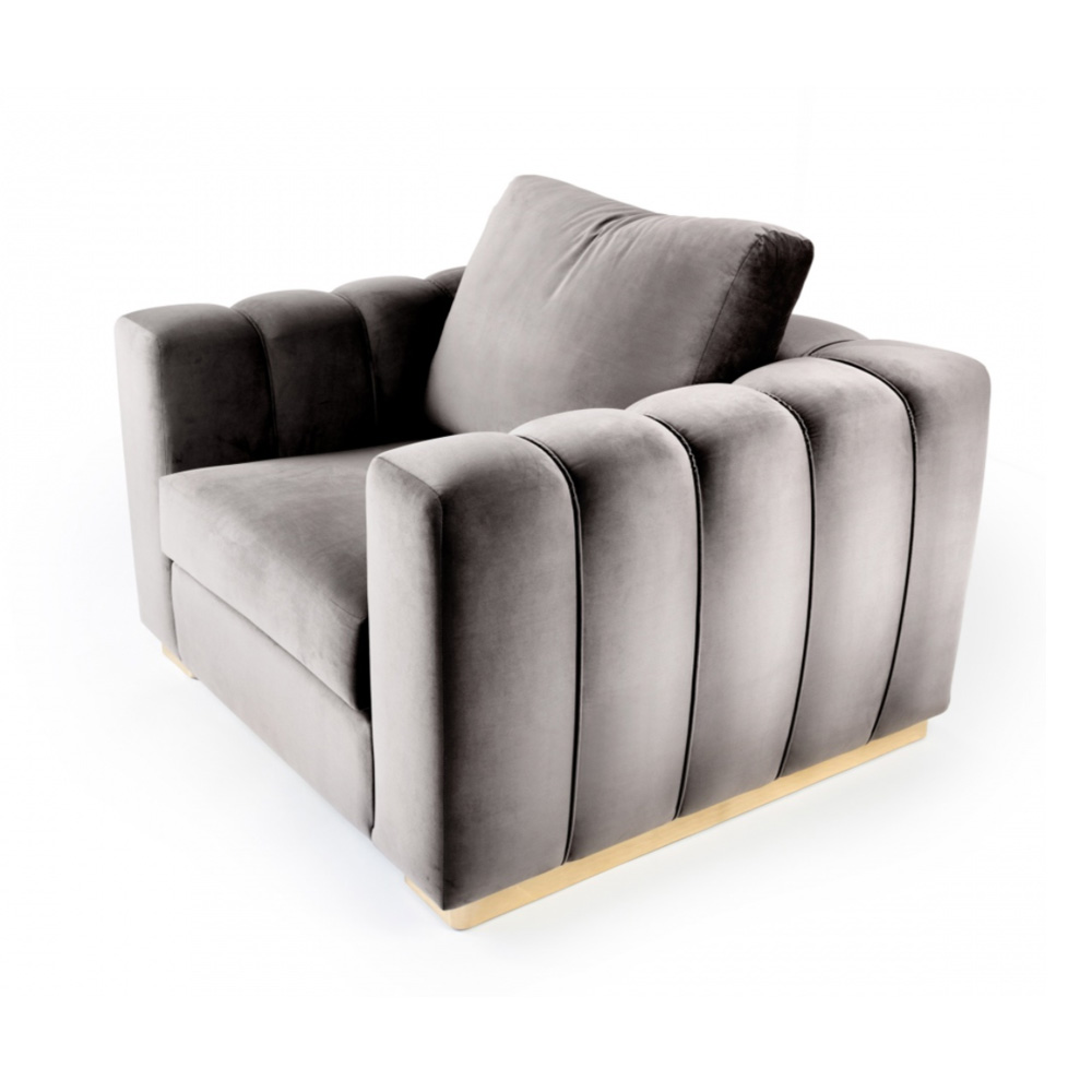 The perfect union of materials, a harmony of forms offering unmistakable style and presence. Based on a wooden frame, this sensational armchair is no exception. Padded with foam of different densities for supreme comfort and longevity. And luxuriously upholstered with a unique vertical stripe quilted soft grey fabric, together with a smooth upholstery for the seat and loose back cushions. The ultimate in chic modern elegance. Features a contrasting metal plinth style base in a polished gold finish. Height 68 cm x width 110 cm x depth 105 cm. Altogether seductive and tactile, providing a compelling contemporary focus to any sophisticated lounge room setting. Part of a fabulous collection including two sofa sizes. 3 seat at height 68 cm x width 260 cm x depth 105 cm, and 2 seat at height 68 cm x width 205 cm x depth 105 cm. Bespoke sizes by request, prices will vary.