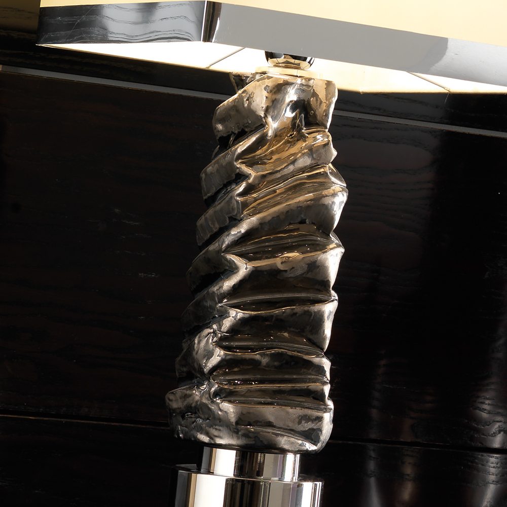 This fabulous design offers a uniquely elegant modern focus. Featuring a platinum plated Majolica column together with a chromed brass base and details. Complete with a modern silk satin ivory lampshade, with a silver band. Altogether providing a luxurious focus to your interior lighting decor.