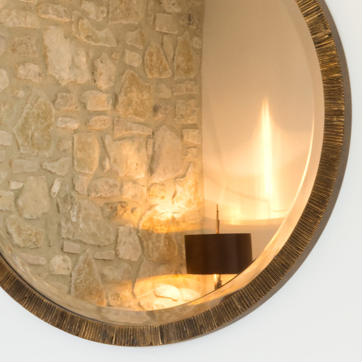 This fabulous round mirror offers a unique modern focus. Featuring a bevelled glass mirror together with a flame cut textured frame with a brushed gold finish. Shown here measuring diameter 86 cm.