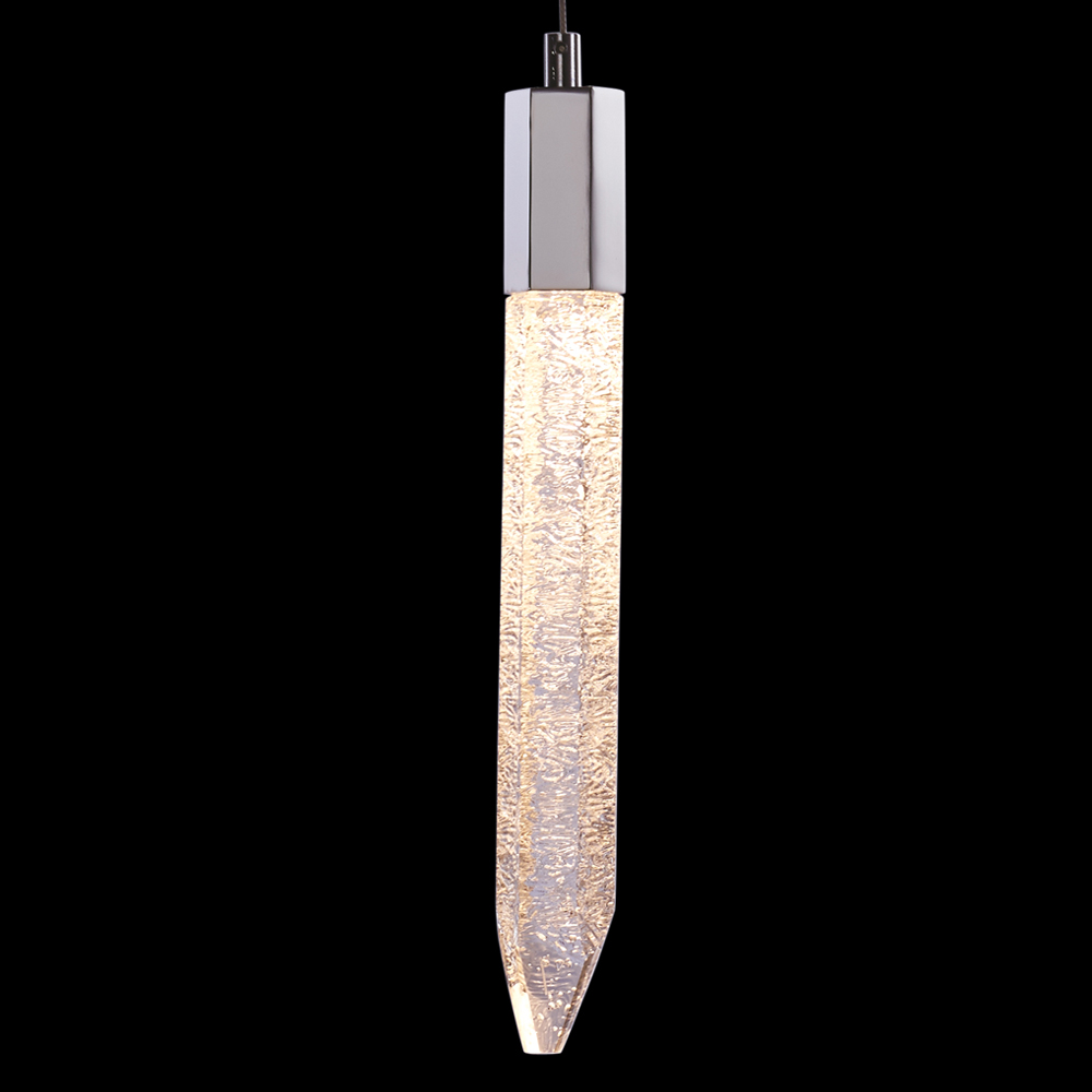 Supported by a sturdy ceiling rose in a suave chrome finish, this pendant light is showcased by a shimmering ice glass element, which creates a fully illuminating effect. Features integrated LED lighting. Hanging height can be altered at installation. This pendant light is also available in alternative sizes and in a gold finish. Prices will vary.