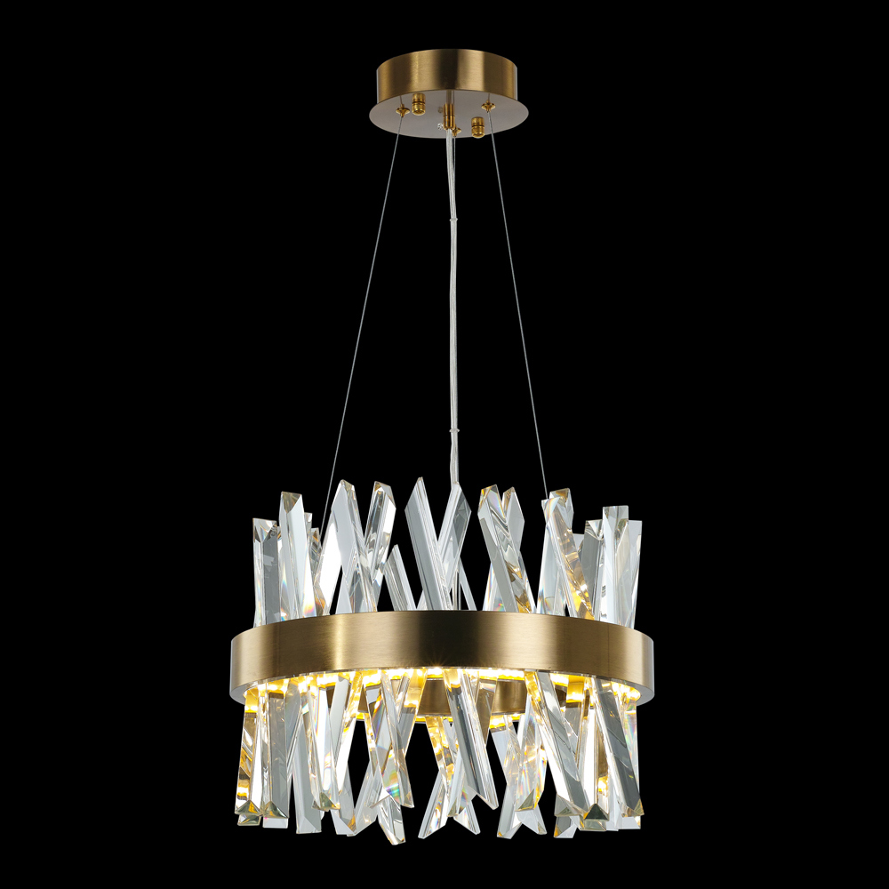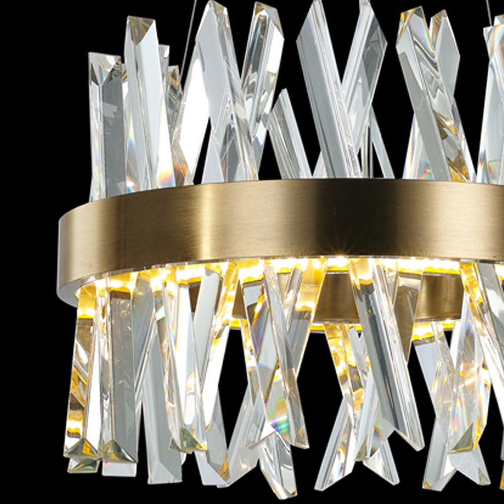 Made with incisive K9 cut crystal elements, this pendant light is brought to the fore by a satin brass frame. Features integrated LED lighting, which is dimmable. Overall hanging height of this piece is 150cm, which can be altered at installation. Also available in a satin nickel finish. Prices will vary.