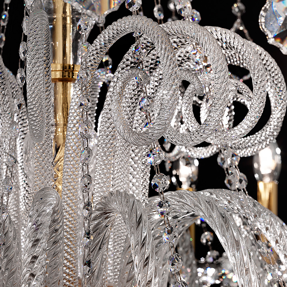 Gold plated metal frame dressed with turned and curled hand blown glass and adorned with a profusion of dazzling clear crystal octagon chains and pendants, also available with premium crystal. Takes 32 x E14 x 40W max bulbs. Not included. Weight 64 kg. Please allow 6 weeks for dispatch.