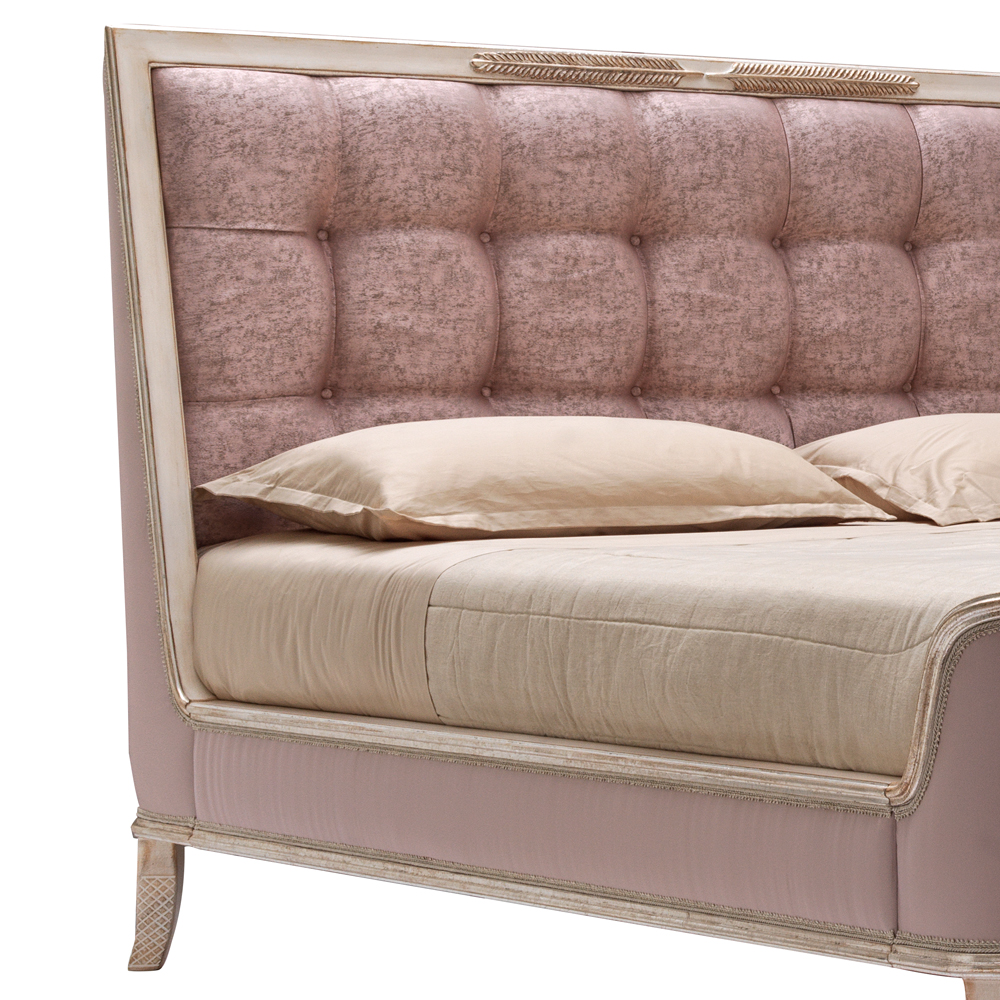 Making carvings its defining aspect, beautifully detailed with perfectly symmetrical feathers to the top of the headboard. In a unique Antique white finish, together with beautiful antiqued hand painted accents of silver. Subtle carved details flowing through to the feet, enhance the design. Padded in various densities and completed with the finest button upholstery to the headboard in a two tone velvet, and base in a dusky pink silk of the highest quality, completed by statement piping detail. For mattress size width 180 cm x length 200 cm. Slats are included. Alternative frame colours, finishes, fabrics as well as customers own and special sizes also available by request. Prices will vary.