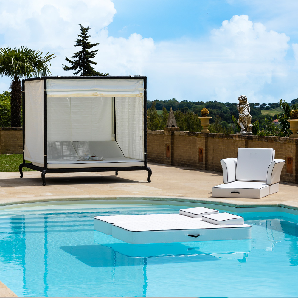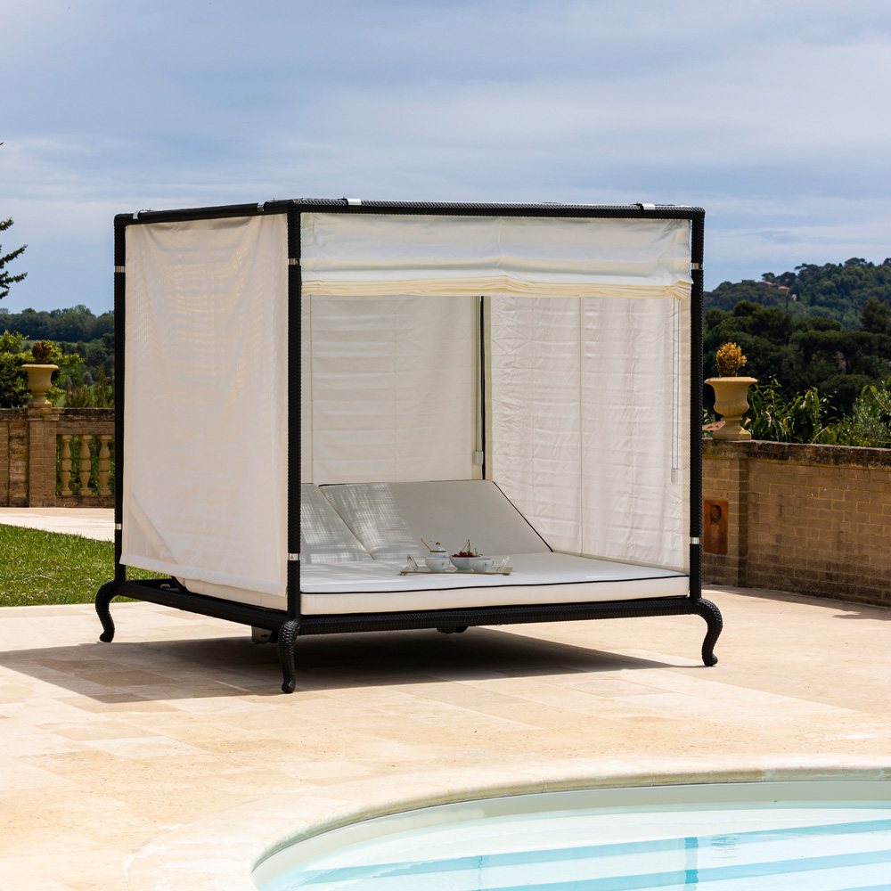 The Four Poster Double Sun Lounger is timeless, the comfort and intimacy of your bed brought to your pool or outdoor area. A truly stunning finely detailed statement that offers the ultimate in comfort and style. Bringing the outdoors in and creating a sense of exclusivity completely in harmony with your natural surroundings for relaxing days and cosy nights. Use in any setting for a functional chic accent. Above all a fabulous show stopping talking piece, adding a true element of high end contemporary design with clean sleek finishing touches creating a striking outline.