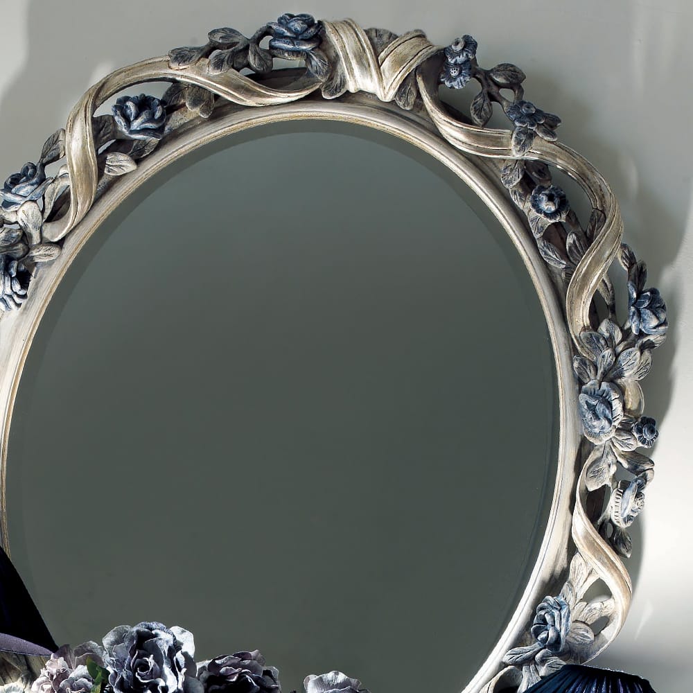 The French Rose And Ribbon Oval Wall Mirror, this utterly gorgeous french style mirror is ideal for over a fireplace or luxurious bedroom setting. Shown here with a pretty silver, grey and blue finish. Height 105 cm x width 90 cm. Also available to order in different colours and finishes including gold and silver leaf or combinations of colours. Please ask for details.
