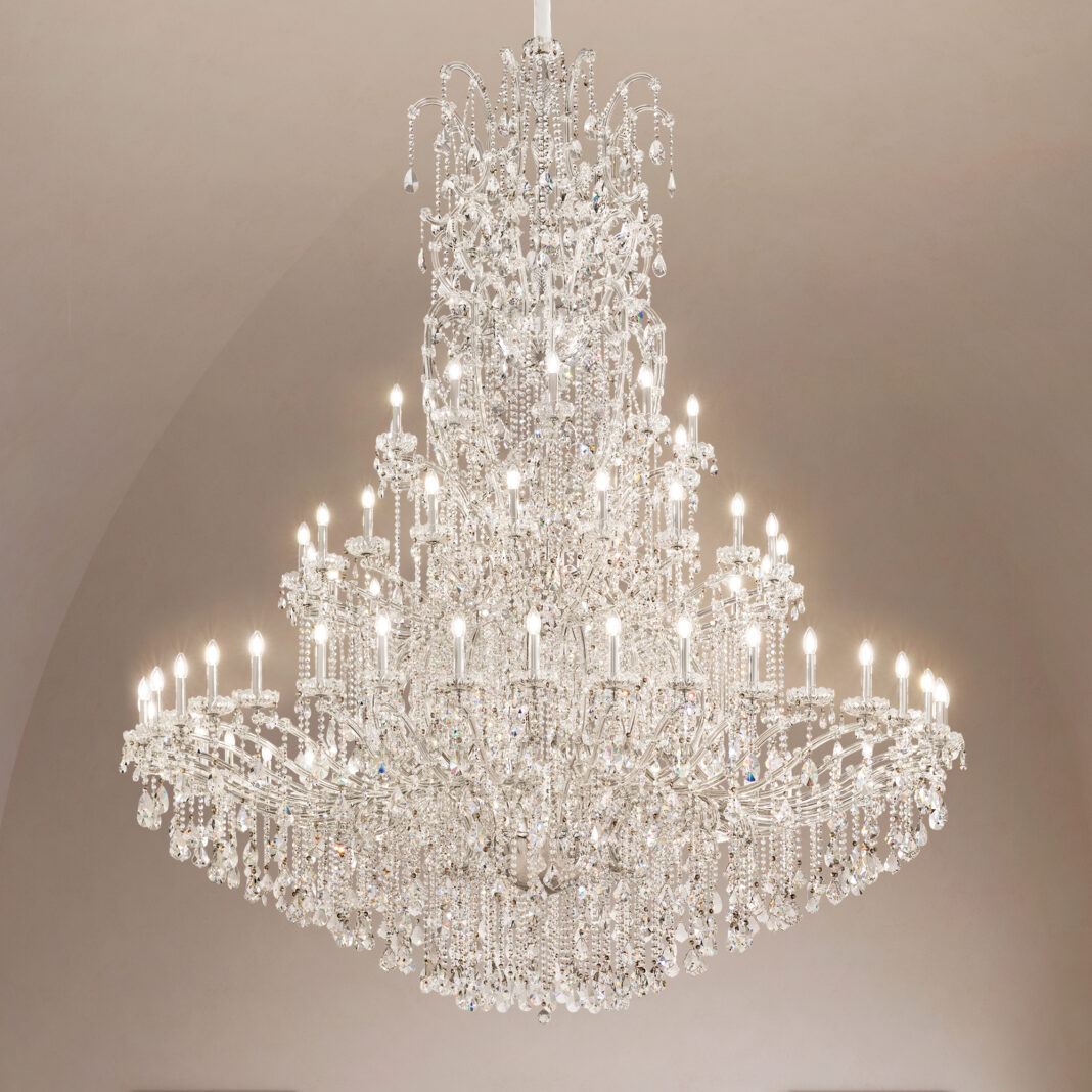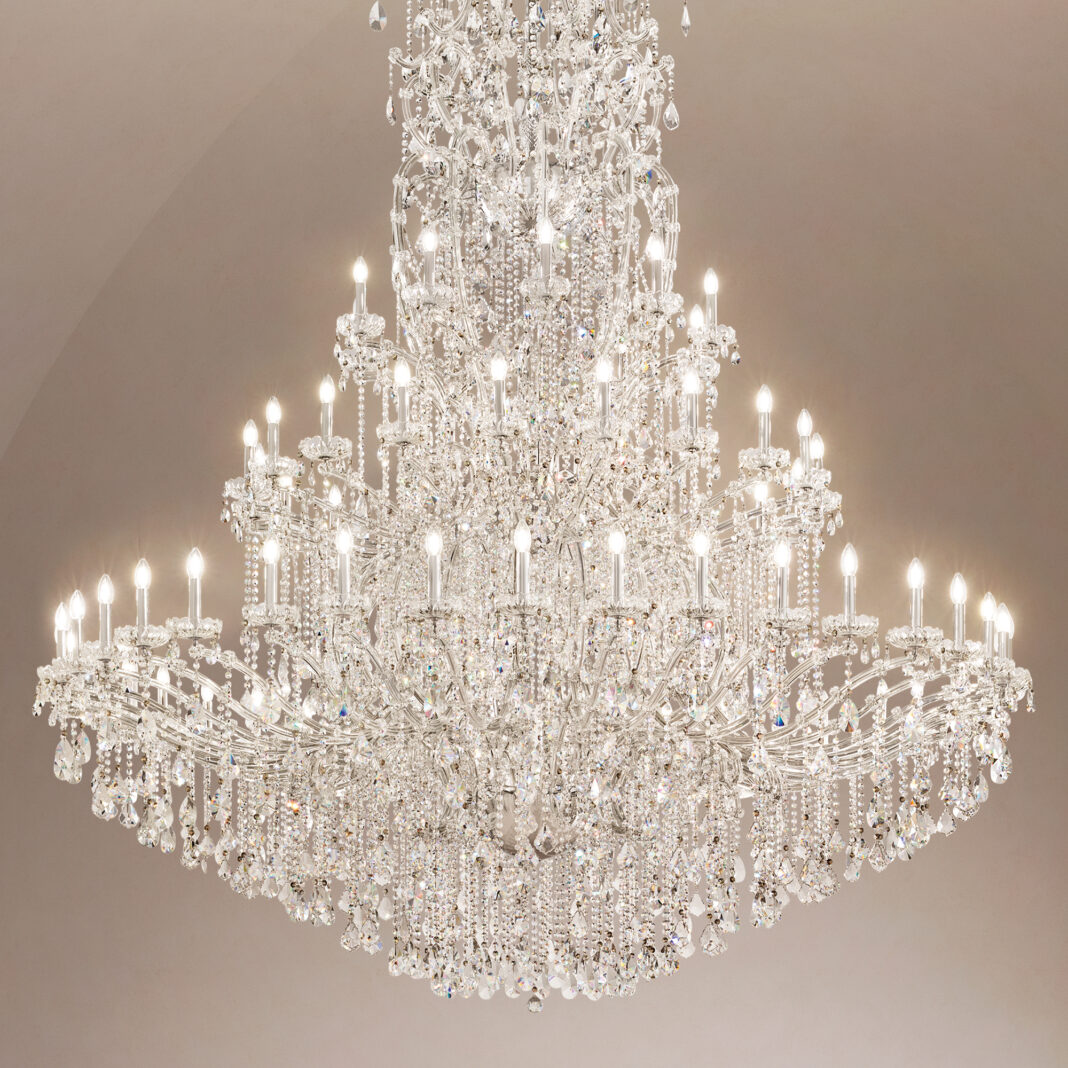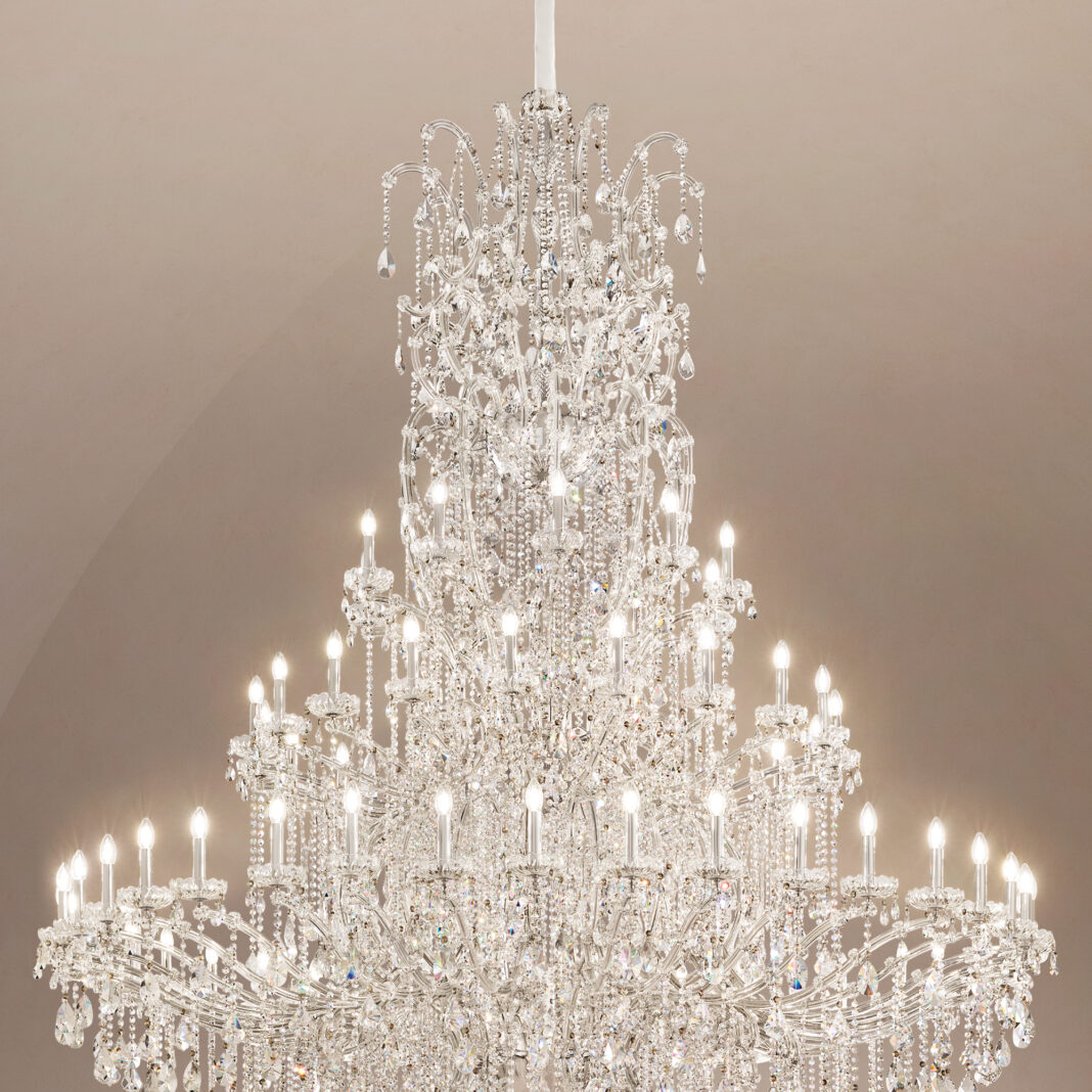Its galvanised tiered metal frame in a polished chrome finish with arms covered in clear glass, is adorned with dazzling crystals and bobèche. Transparent with a dash of smoked, in either half cut glass, cut crystal or premium crystal. Radiating a warm and inviting glow. Weight 233 kg. Requires 70 x E14 10 W MAX bulbs.