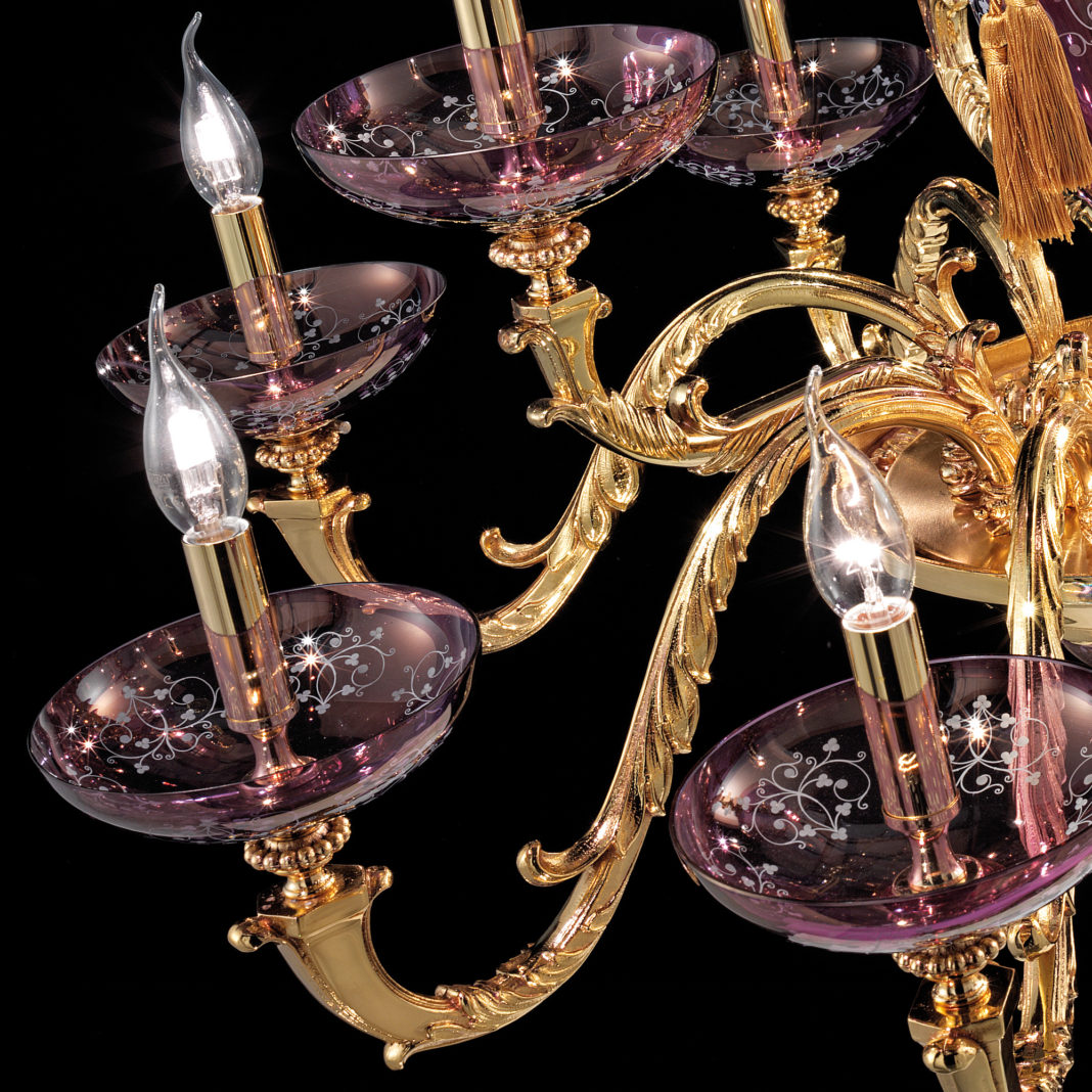 A large beautifully detailed ornate brass structure in a polished french gold brass finish, with 12 arms in 2 tiers supporting an elegantly shaped body of glass and glass bobeches adorned with Tuscan engravings. And further decorative elements that are handmade, and finished in 24K gold with ruby stone detailing. Completed by a complementary feature rope tassel. Requires 12 x max 40W E14 Bulbs, which are not included. Weight 33 kg. Available in various sizes, and with Amber or Ruby glass by request. Prices will vary.