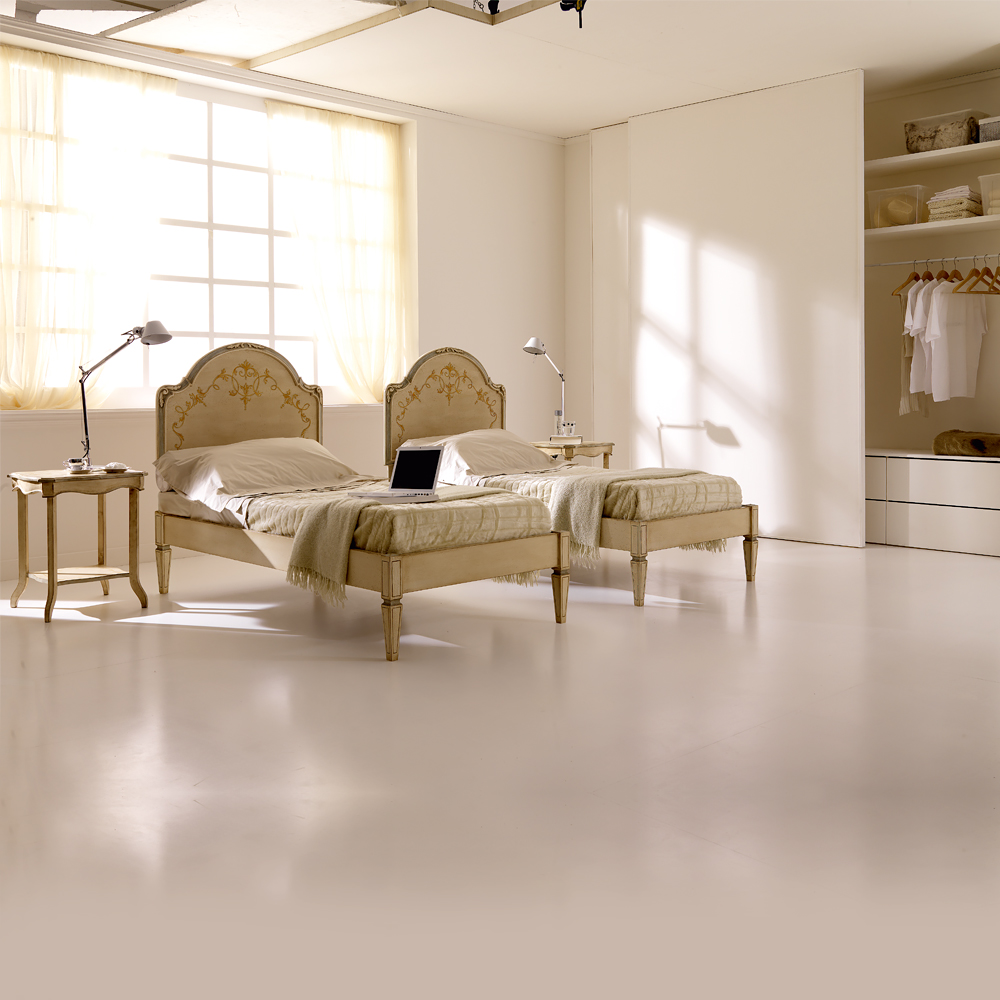 The Handpainted Carved Louis Reproduction Single Bed is the most stunning of additions to any bedroom setting. Adding traditional classic style, truly striking when used as here in a twin set. Shown here in a beautiful soft satin ivory and ash accentuating the curved lines, with an aged patina antiqued finish. Complemented finally by a strikingly unique handpainted decorative embellishment. Headboard height 133 cm x width 95 cm x length 209 cm, mattress width 90 cm x length 200 cm. Therefore the overall dimensions are 5 cm wider and 9 cm longer than the mattress size of choice. Alternative fabrics, frame colours, finishes and special sizes available too on request. Prices will vary.