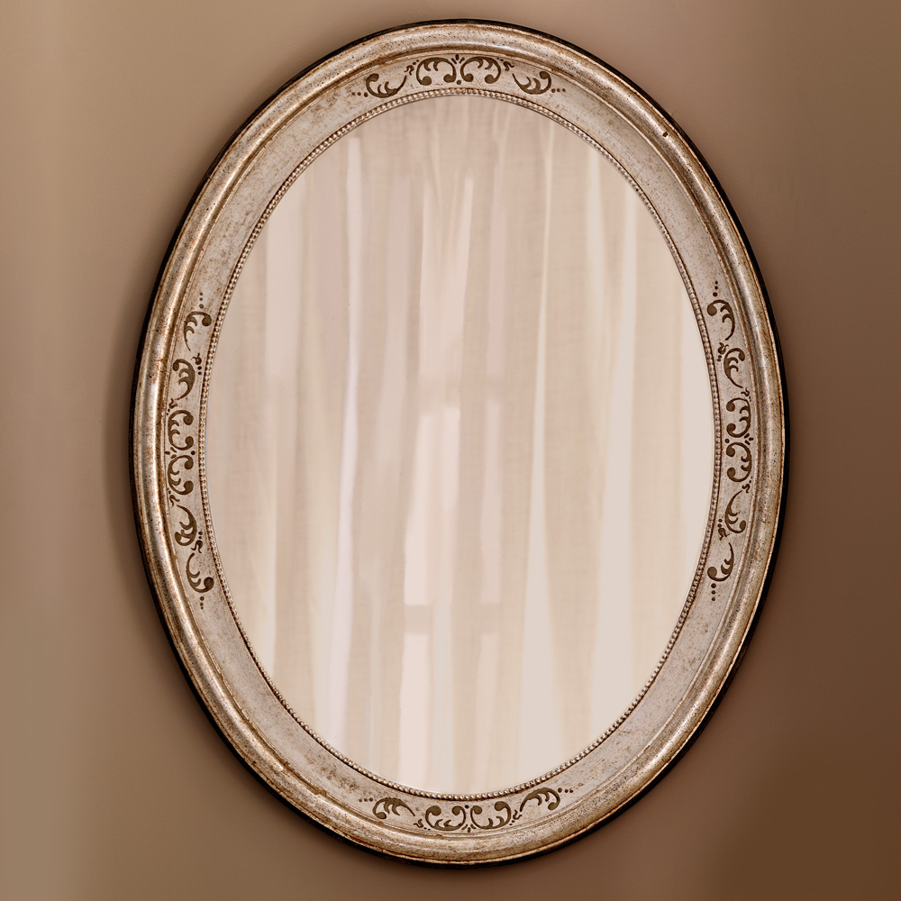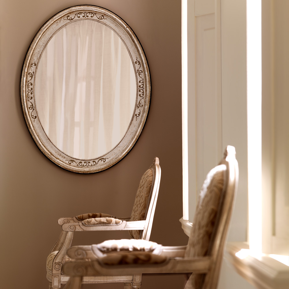 Handpainted Silver Italian Oval Mirror. A statement piece for any wall in the house, striking in any setting. Over a roaring fireplace, on a bedroom wall or inviting in a hallway. Truly versatile. Can be hung horizontally or vertically for two completely different effects. In a fresh white finish with a hand painted pattern and champagne silver antiqued detail to the frame and delicate beading. Height 110 cm x width 86 cm. Alternative sizes, frame colours and finishes are available. Prices vary. Made to highest standards. Please allow 12 weeks for dispatch.