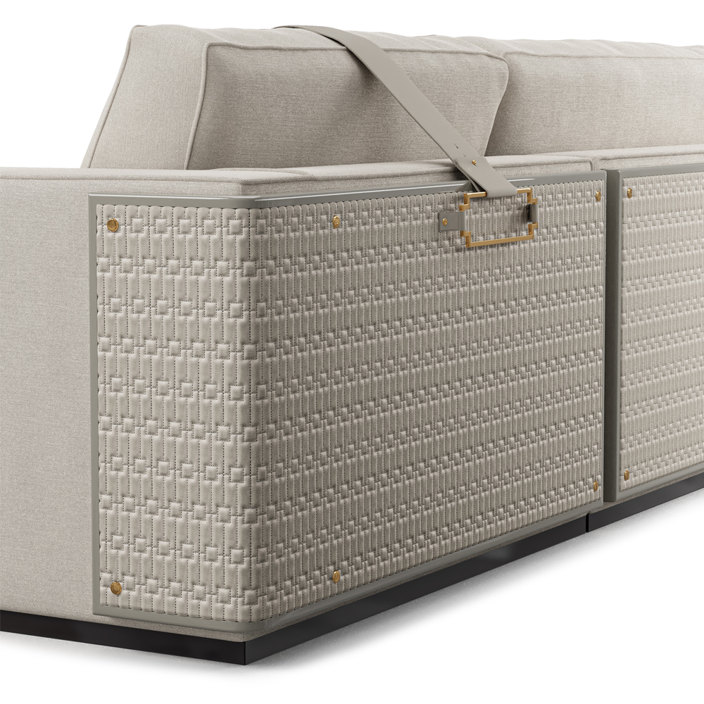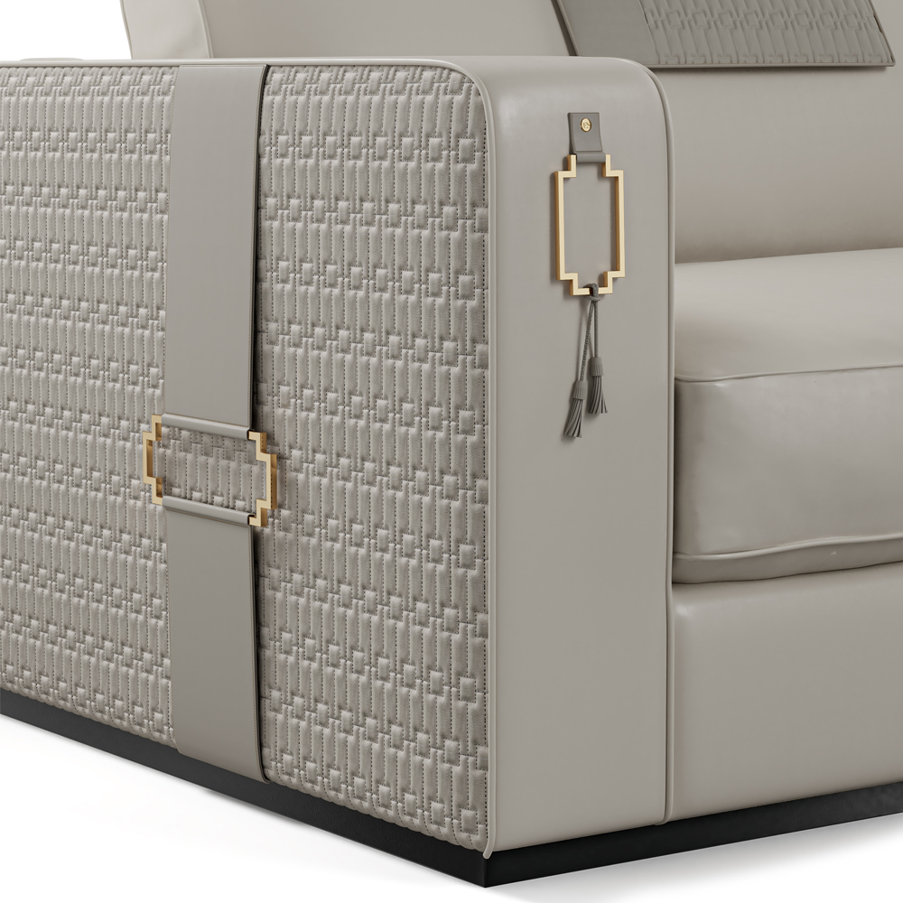 The perfect union of materials, a harmony of forms offering unmistakable style and presence. A fabulous wooden structure, padded and upholstered in the finest premium leather with statement distinctive Art Deco metal detailing in a champagne gold finish. Features include two front handle and tassels, two side belts and medallion, two quilted armrests, two head cushions, two back handles and four loose pillows. These elements are optional – completing this piece and creating a truly fabulous focus. But can be excluded if preferred. Seat height 38/40 cm, arm height 65 cm. Weight 185 kg. Scatter cushions are not included. Alternative leathers, fabrics, lacquers and metal finishes are available upon request. Prices will vary.