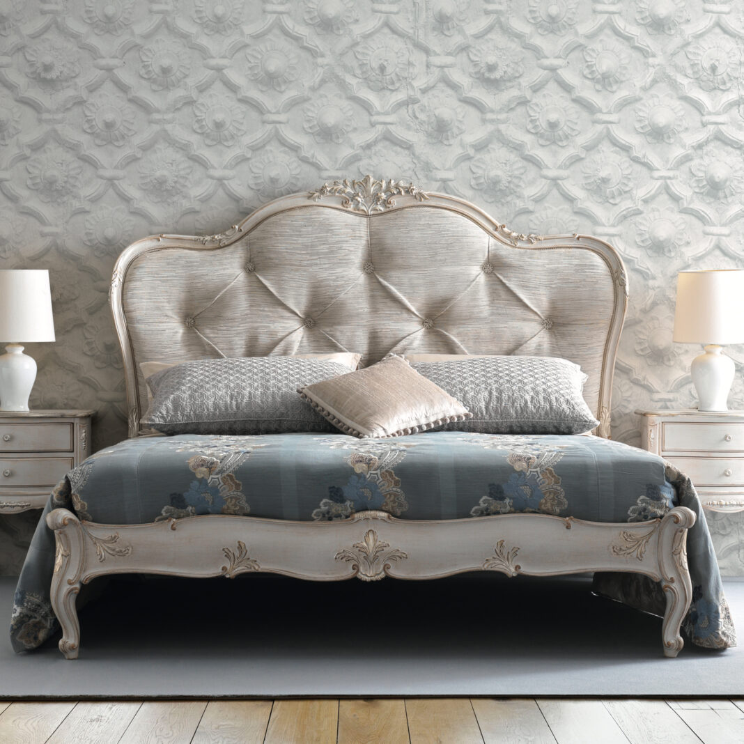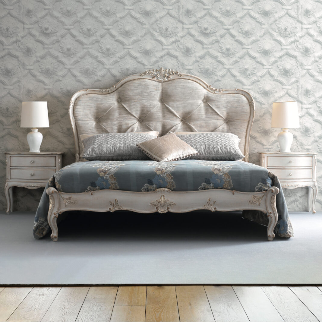 Beautifully upholstered with divine carved detailing. A wooden structure shown here in an Antique pearl grey finish together with beautiful antiqued hand painted accents of silver to the intricate carved detailing and feminine curves of the classic headboard and detailed base. Padded in various densities and completed with the finest button upholstery to the headboard in a rich textured fabric of the highest quality, completed by statement striking button and piping detailing. For mattress size width 180 cm x length 200 cm. Slats are included. Alternative frame colours, finishes, fabrics as well as customers own and special sizes also available by request. Prices will vary.