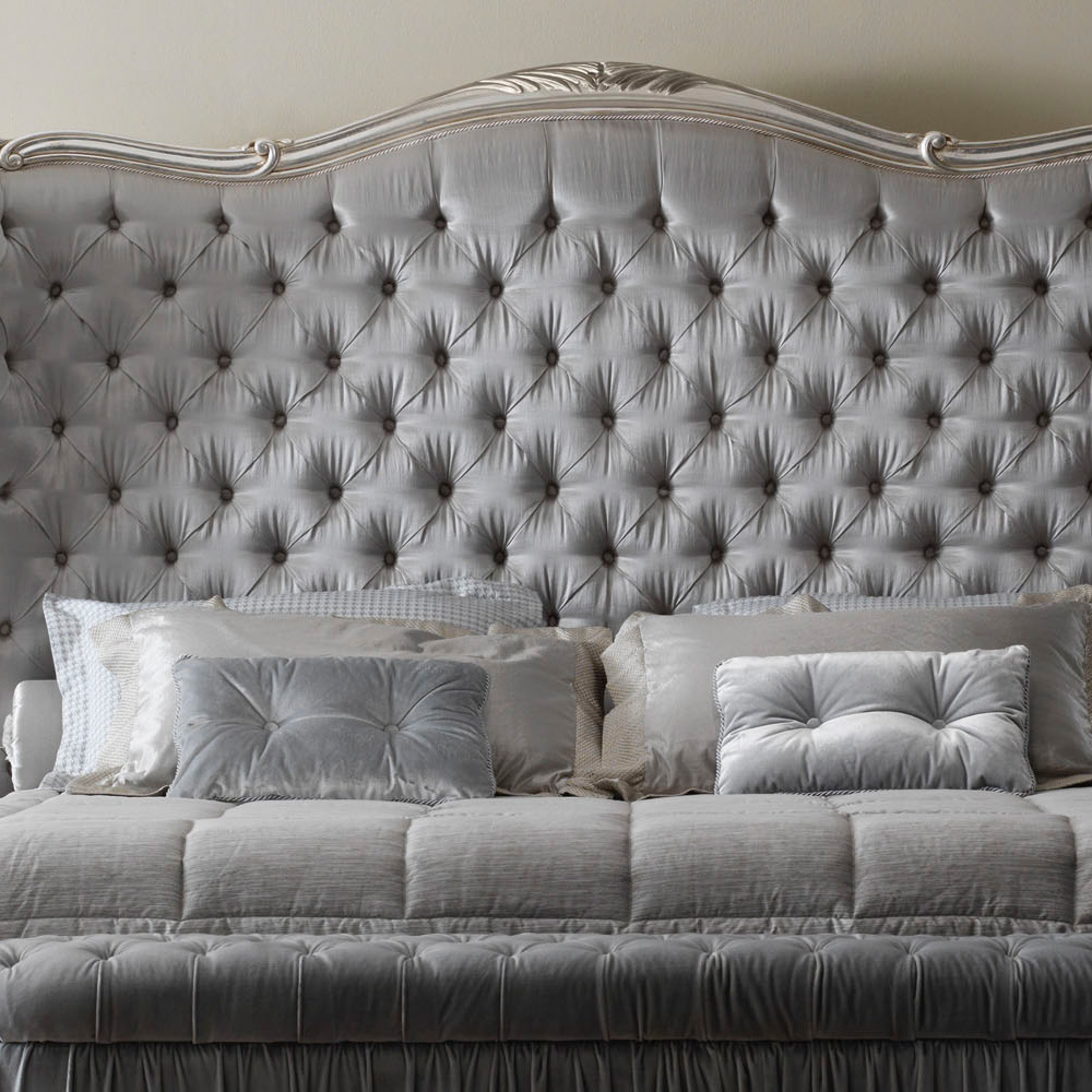 Superbly executed by master Italian craftsmen these designs are outstanding in their use of luxury materials and attention to detail. The headboard and base are finished in an Antique Silver, accentuating the exquisite curves and ornate carvings. The headboard is then padded and sumptuously upholstered in the finest silk fabric. Height 177 cm x width 215 cm x depth 220 cm to fit a 180 cm x 200 cm mattress, and height 177 cm x width 235 cm x depth 220 cm to fit a 200 cm x 200 cm mattress. Other sizes are available to order with alternative fabrics and leather, including customers own fabric, frame colours and finishes. Prices will vary. Includes headboard, base and slats.