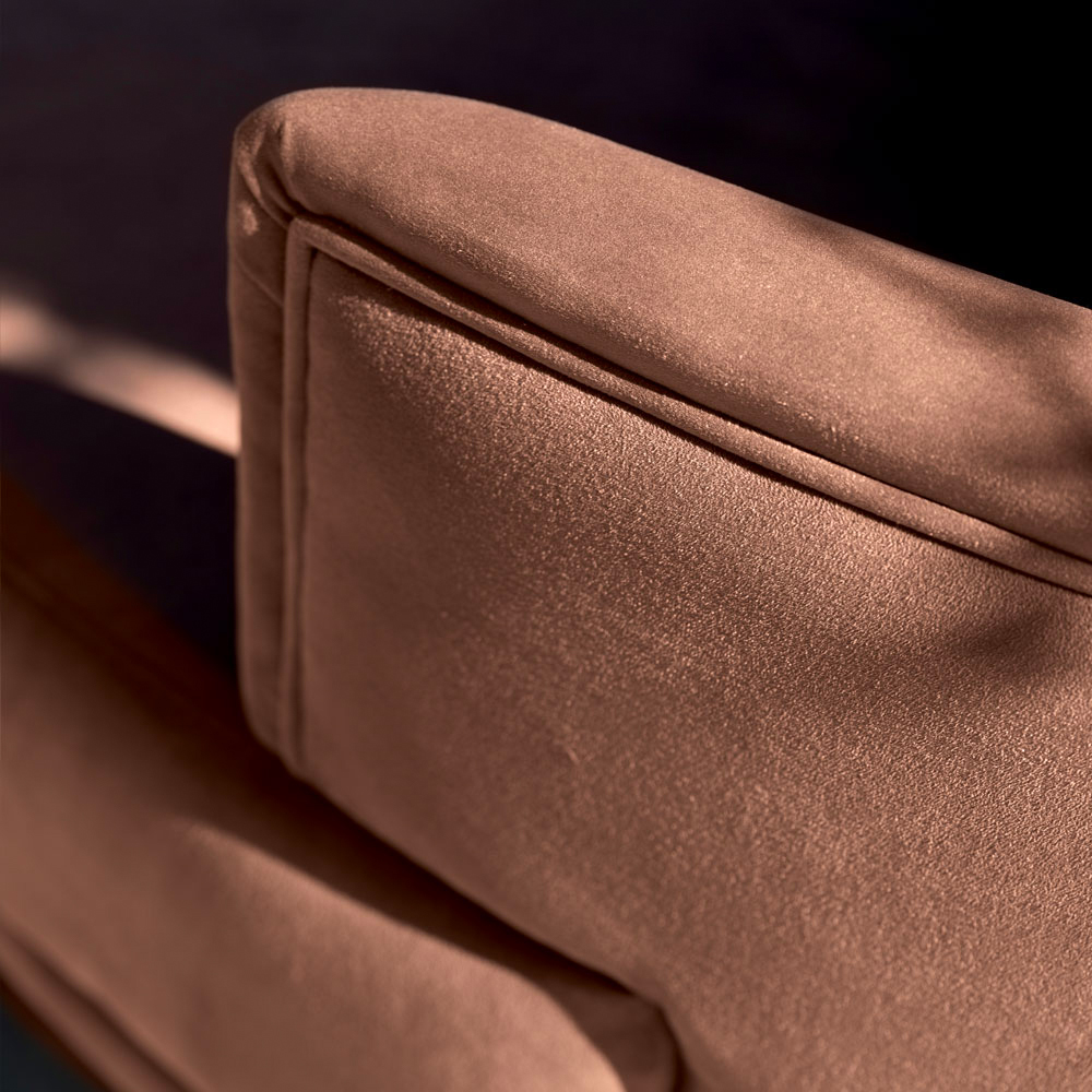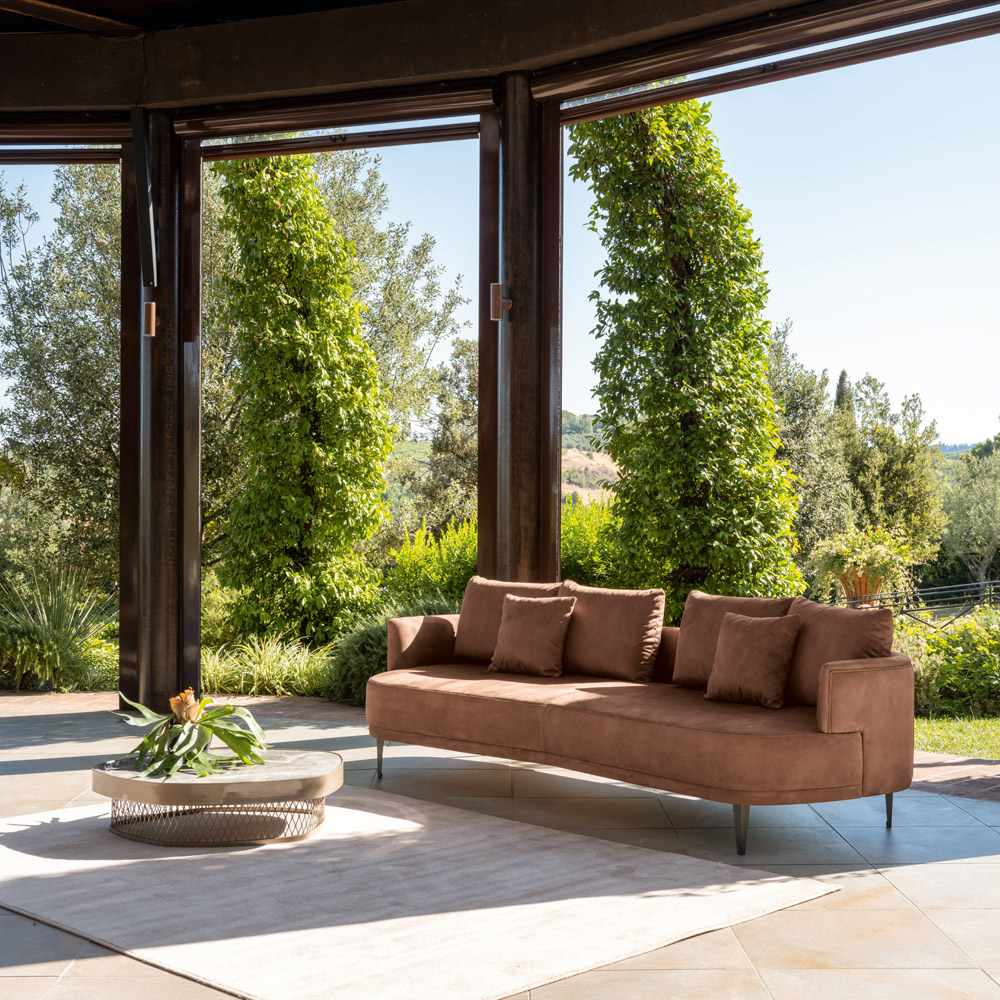 A sturdy wooden frame, this sofa is upholstered in a rich tan luxury fabric and supported by natural iron legs. The four back cushions, and two scatter cushions are included. Alternative finishes, fabrics and customised sizes including a smaller sofa and armchair are available to order. Prices will vary.