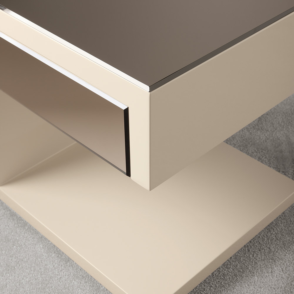A solid wooden structure finished to the highest standards in a warm ivory high gloss lacquer, enhanced by the top and drawer finished in a bronze mirror. Completed with a plinth style base. Above all providing the perfect modern storage solution. Weight 42 kg – storage space under drawer being height 40 cm. Various other finishes, combinations and sizes are also available by request. Prices will vary. This bedside table is part of the most divine collection.