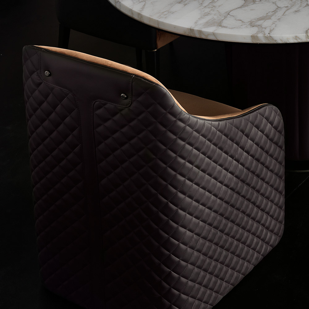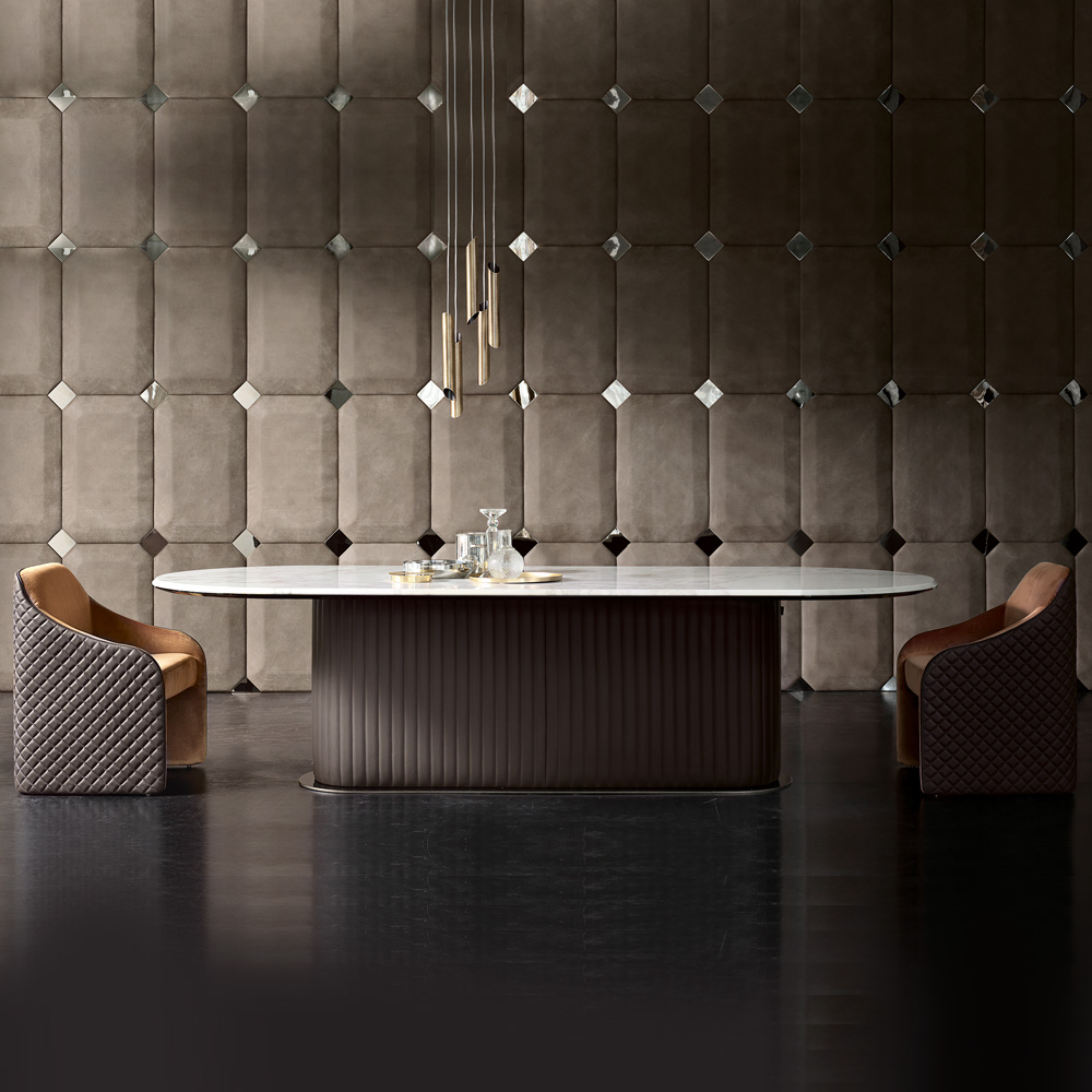 The table is a balance by design, giving the whole structure of these dimensions an unexpected lightness. A plinth style steel base in a titanium finish, with a vertically padded upholstered leather pedestal revealing feature stitch detailing. Beautifully completed by a striking curved Calacatta Oro marble table top. In 2 sizes as standard. Height 73 cm x width 250 cm x depth 120 cm – weight 320 kg. And height 73 cm x width 300 cm x depth 120 cm – weight 350 kg.