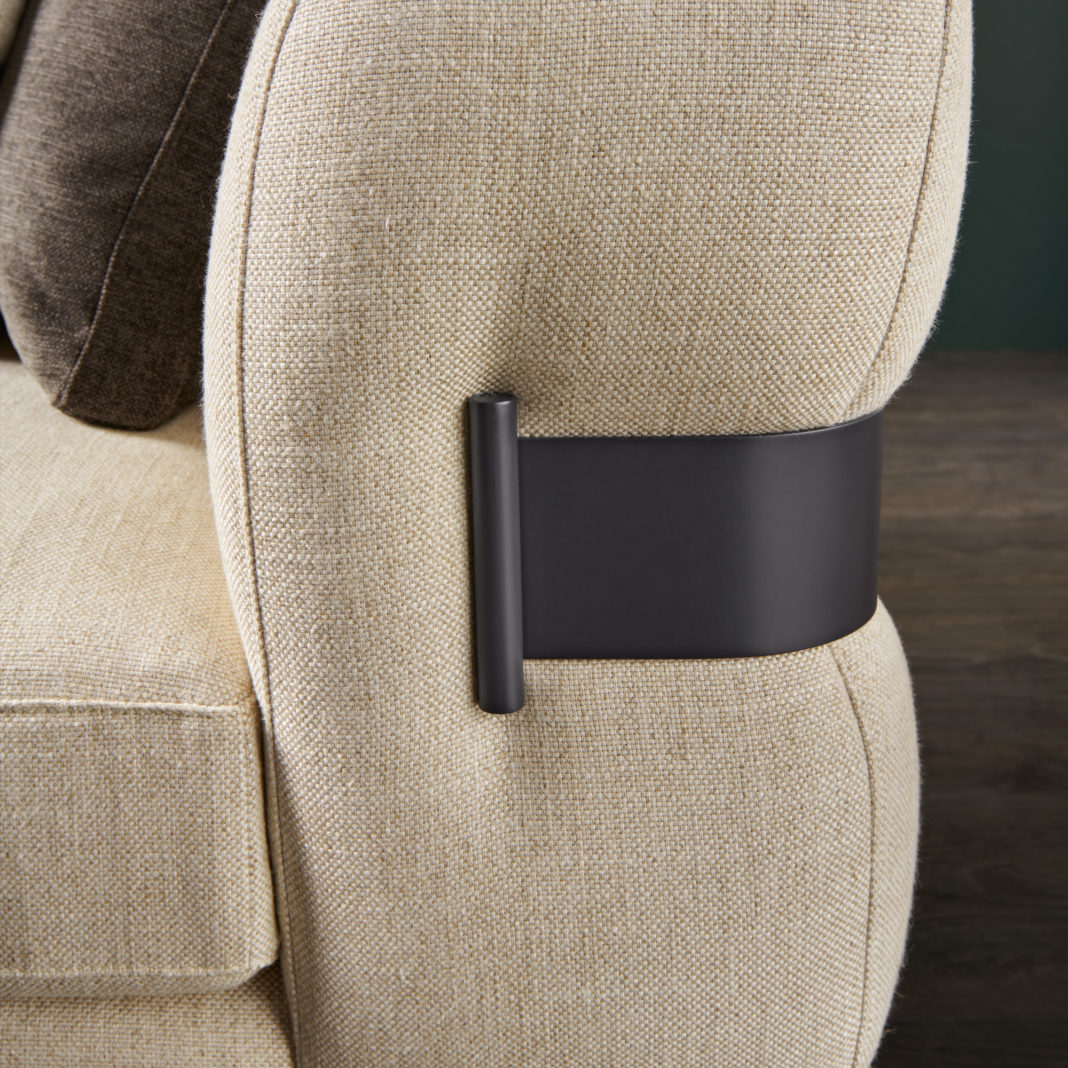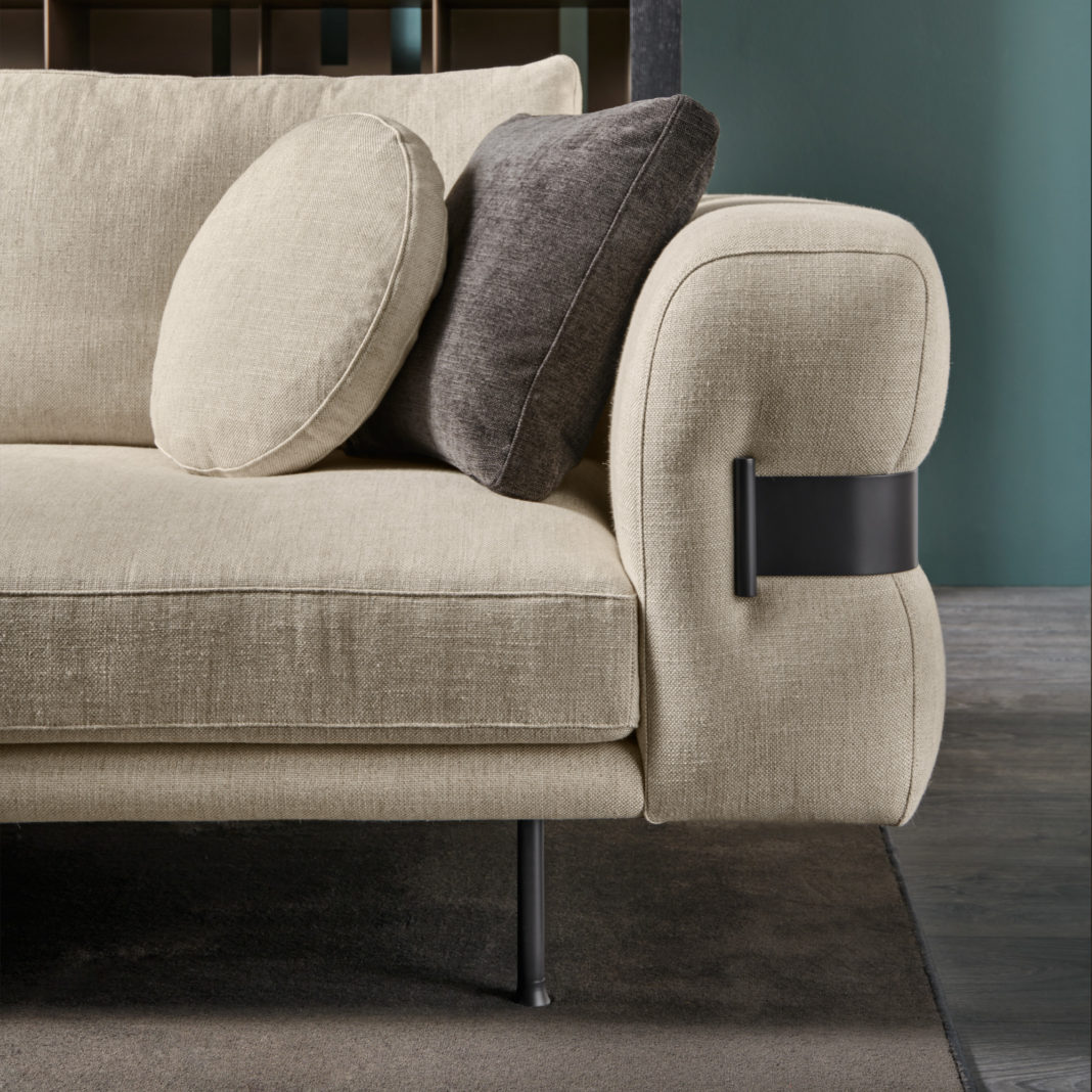 A solid beech and poplar wooden structure with elastic spring support belts for the ultimate in comfort. Beautifully padded in different densities and upholstered by Italian master craftsmen to the highest standards in a luxurious textured fabric in a natural tone of the finest quality. The feature metal legs and cinched band detail are in an anthracite iron finish – integrated into the perimeter of the sofa, supporting the armrests and wrapping around the seat, creating a feeling of lightness. Two modules combined, the left big chaise longue element being height 66 cm x width 165 cm x depth 165 cm, and the right double seat module with armrest height 66 cm x width 240 cm x depth 105 cm. Please note that the scatter cushions are available but not included in the price. Available in an array of modular combinations, and in alternative luxury upholstery options, including traditional and faux leathers, suedes and nubucks together with the metal detail in various other finishes. Bespoke sizes available upon request. Prices will vary.