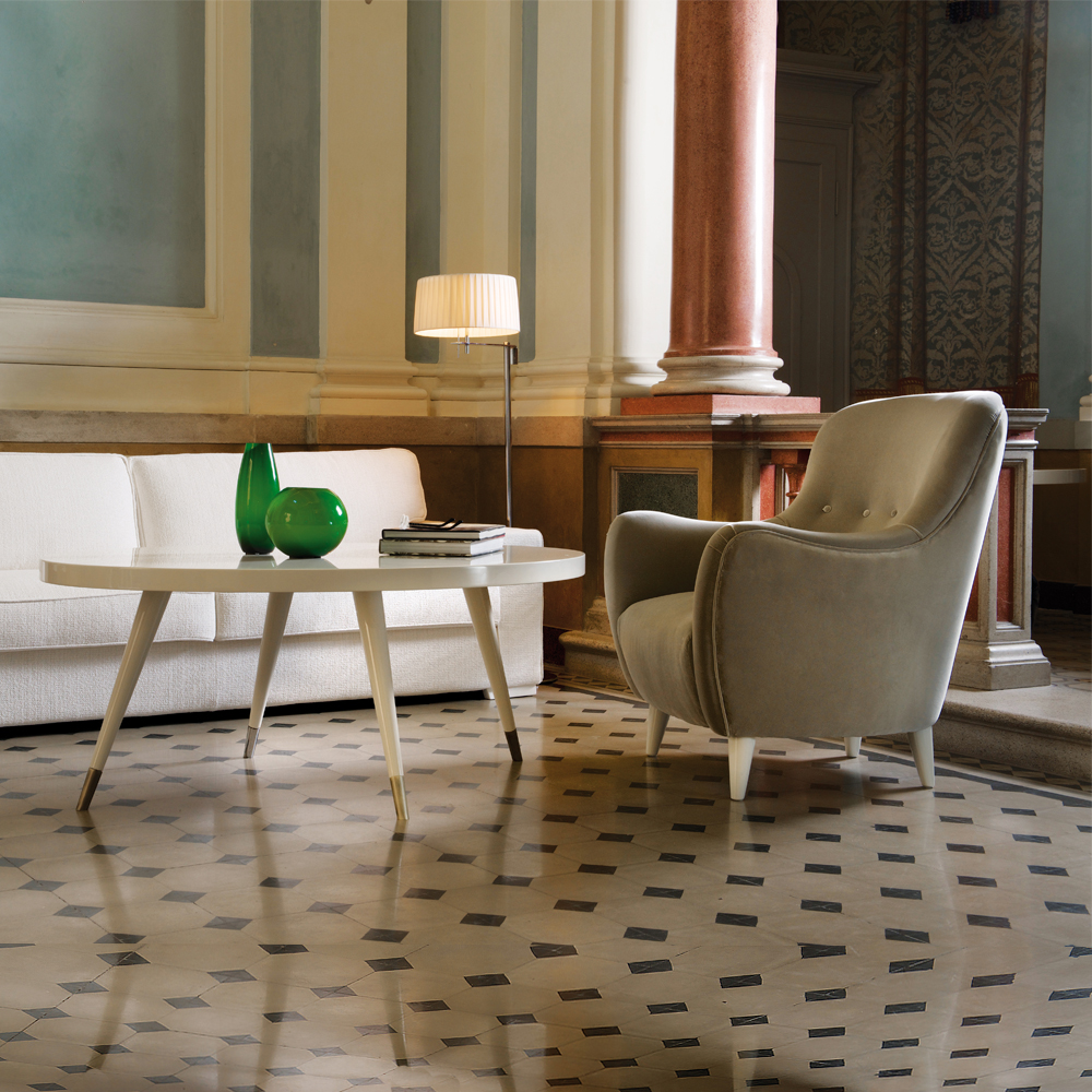 Fully padded to the highest standards this elegant design is upholstered in a premium grey cotton fabric and complemented by piping in the same fabric. Elegant legs in a high gloss white lacquer finish complete this sophisticated design. Measuring height 99 cm x width 84 x depth 99 cm. Seat height measuring 43 cm. This stunning design is also available in alternative fabrics and leather, with a choice of matt lacquered legs and piping in contrasting shades. Prices will vary.