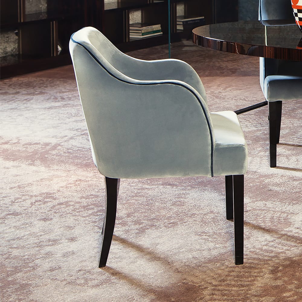 A sleek contemporary armchair, shown here beautifully crafted from solid wood by Italian artisans. Fully upholstered to the highest standards in a luxurious rich egg shell-blue velvet for supreme comfort. Sumptuously padded seats, are a statement further complemented by contrasting elegant black piping. Refined contemporary legs, in a high gloss black lacquer finish, complete this stunning design. Chair height 88 cm x width 62 cm x depth 62 cm. Seat height 45, armrest height 68 cm. Can be manufactured using alternative finishes, leathers and a variety of luxurious fabrics including customers own. Prices will vary.