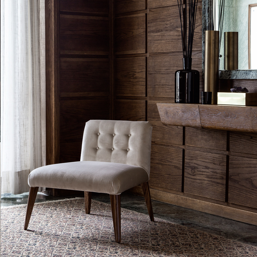 A wooden structure with a 6 cm elastic belt spring system for added support, foam and memory foam padded in various densities, upper layer in air soft, top layer of cushions and seat in 3 cm memory rubber with the addition of a soft layer of goose down for the ultimate in comfort. Upholstered, with button detail to the highest standards in the finest soft beige fabric. Completed by lacquered glossy brushed wooden angled legs with retro tones. Height 65 cm x width 70 cm x depth 66 cm, weight 18 kg. Available in alternative fabrics, including customer own and various leathers. Prices will vary.
