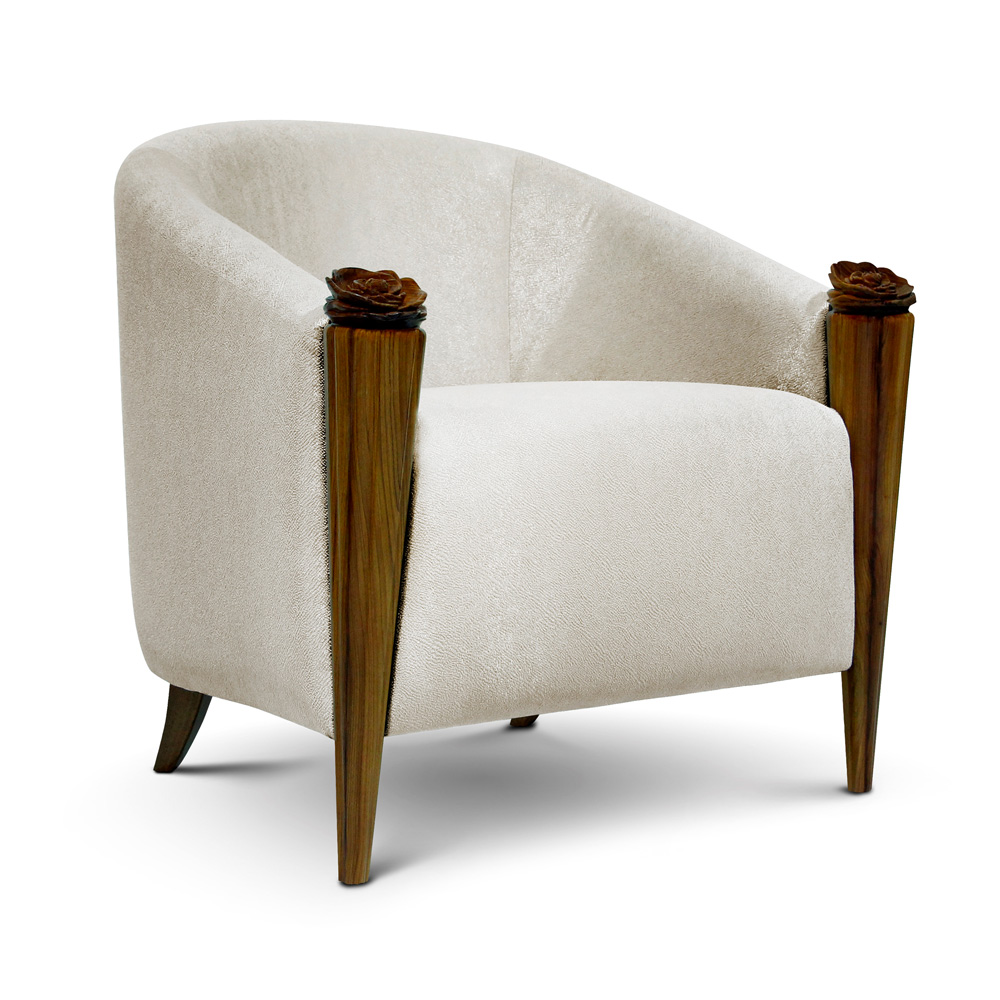 Hand-crafted with remarkable attention to detail by master craftsmen. With organic smooth lines, and solid wooden carved flower detail representing the blossoming of nature. The intricate detail brings soul and personality to interiors. The contrast between the padded textured luxury fabric upholstery and the richness of the solid wood tones bringing a strong look to this elegant piece. Creating a fabulous focus. Height 82 cm x width 77 cm x depth 82 cm. Available to order in various sizes, finishes and fabrics including customers own by request. For this we need 4 metres. Prices will vary.