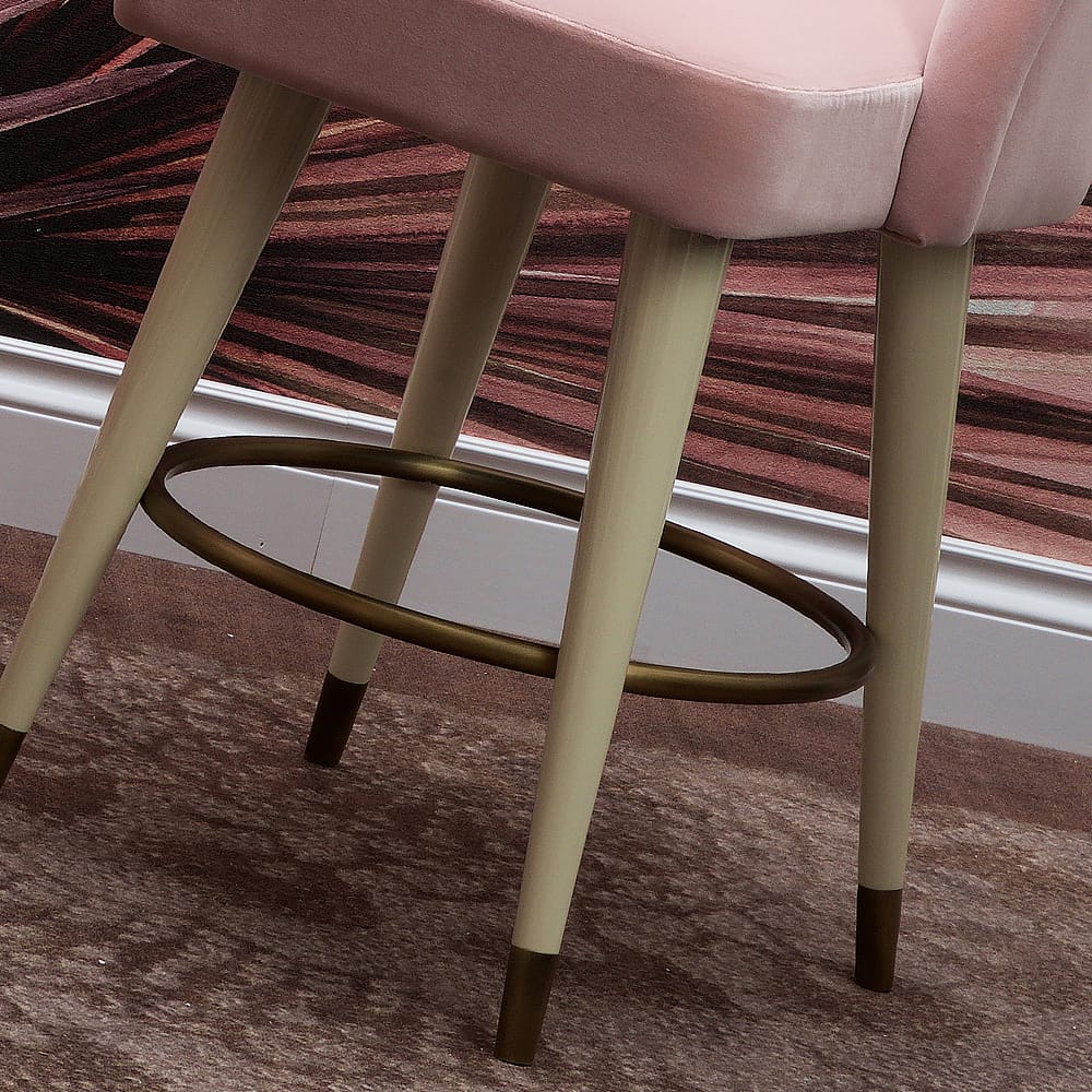 This elegant design features a beautifully carved frame in a high gloss cream lacquered finish and a polished bronze circular feature footrest. Each bar seat is padded and superbly upholstered in the most luxurious, soft pink velvet. Offering great comfort. Complemented by elegant most refined contemporary metal glides in a polished bronze finish. In 2 sizes as standard. Measuring height 95 cm x width 59 cm x 58 cm, seat height 64 cm and height 115 cm x width 59 cm x 58 cm, seat height 84 cm. Available in a selection of alternative fabrics, colours and finishes, including matt lacquered and with chrome or brass glides. Prices may vary. Shown here paired with the divine Modern Italian Designer Bar Table, also available here at Juliettes Interiors and creating the most fabulous set.Â