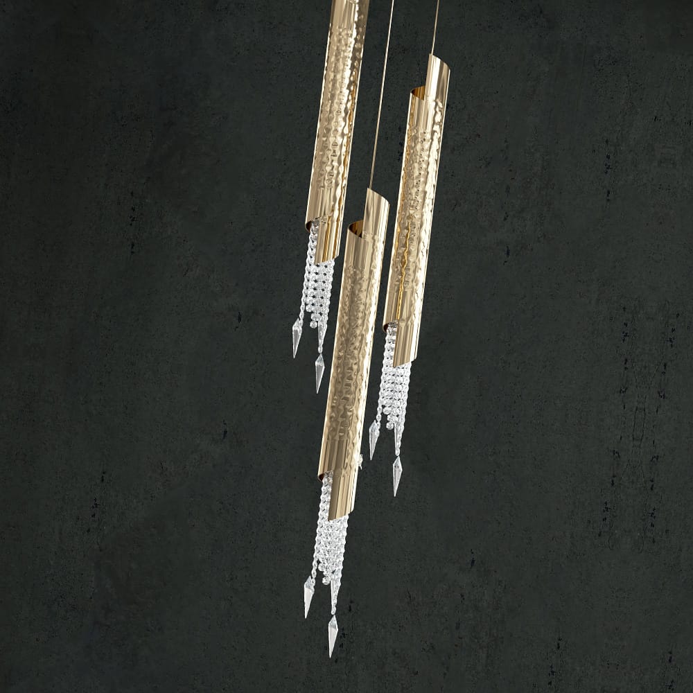 The most beautiful layered effect of 3 tubular shapes with a striking hammered effect, housing cascades of sparkling Asfour crystal drops. Creating a truly fabulous dazzling focus. Elements of varying lengths, hanging from an understated circular ceiling mount. Allowing the pendants to shine. Formed in brass and shown here in a polished 24 carat gold finish. Height 125 cm x diameter 40 cm, which uses 3 x G9 40W bulbs, not included. Weight approximately 3.6 kg. Hanging heights can be customised by request. Also available as a single pendant, with crystal drops, in other finishes, such as a matt, polished and brushed gold, brass, nickel, black nickel and copper. Offering the ultimate in versatility. Prices will vary.