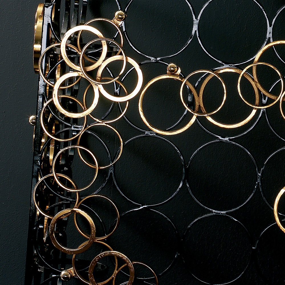 This fabulous modern console is no exception, featuring a stunning forged iron frame consisting of layers of hand made black lacquered and gold plated rings together with a cut crystal glass top.