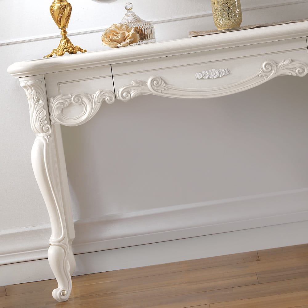 The High End Italian Dressing Table And Ornate Gold Leaf Mirror Set is a beautiful statement pairing which adds style to any setting, with the versatility to also be used perfectly as a console table set. The Italian Dressing table with hidden drawer is carved from solid wood and shown here in a vibrant white painted finish accentuating the carved details and embellishments. Height 79 cm x width 136 cm x depth 50 cm. Alternative sizes and finishes are available by request.