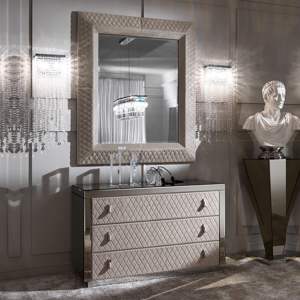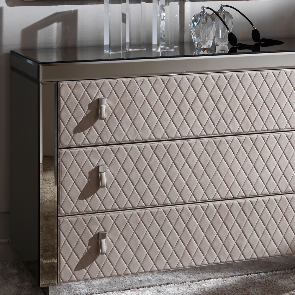 High End Italian Mirrored Nubuck Drawers. This exceptional hand-crafted chest of drawers offers superb Italian style, seductively modern and elegant. Exquisitely made by master craftsmen this set of drawers is outstanding in its attention to detail, providing a luxurious modern focus. Featuring 3 lined drawers beautifully finished with a fabulous quilted nude nubuck leather, creating a remarkably sumptuous focus along with a glamorous storage solution. Set in superb contrast against a bronzed mirrored structure together with a stainless steel base. The drawers are fitted with a Blumotion slide system for effortless closing together with unique looped nubuck chromed handles adding further chic Italian style.