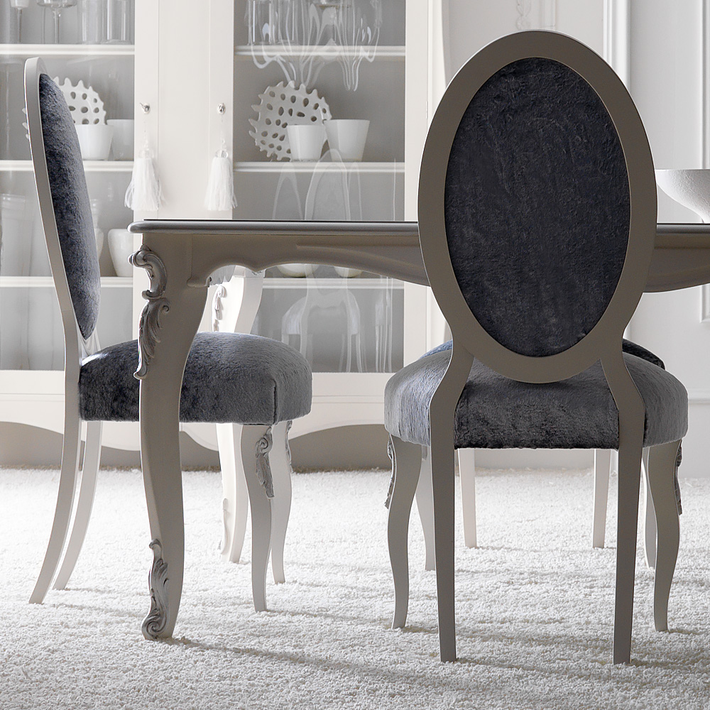 The High End Italian Silver Leaf Dining Table Set is a beautiful fresh statement for any dining area, creating a dramatic effect. The dining table is shown here with a vibrant antique white painted finish and hand painted silver leaf to the carved details. Table shown is square, height 80 cm x width 150 cm x depth 150 cm. Two other options as standard. Rectangular extendable version, height 80 cm x width 200/300 cm x depth 100 cm. Oval extendable version, height 80 cm x width 200/300 cm x depth 100 cm. Paired here perfectly with the High End Italian Oval Dining Chair in a matching finish with a luxurious rich purple crushed velvet upholstery. Height 109 cm x width 53 cm x depth 54 cm. Also available in alternative frame colours, finishes and fabrics including customers own fabric. Prices vary. Available as a set or individually. Made to a world class standard. Please allow 9 weeks for dispatch. Made in Italy with a unique attention to detail, creating a contemporary atmosphere for your home.