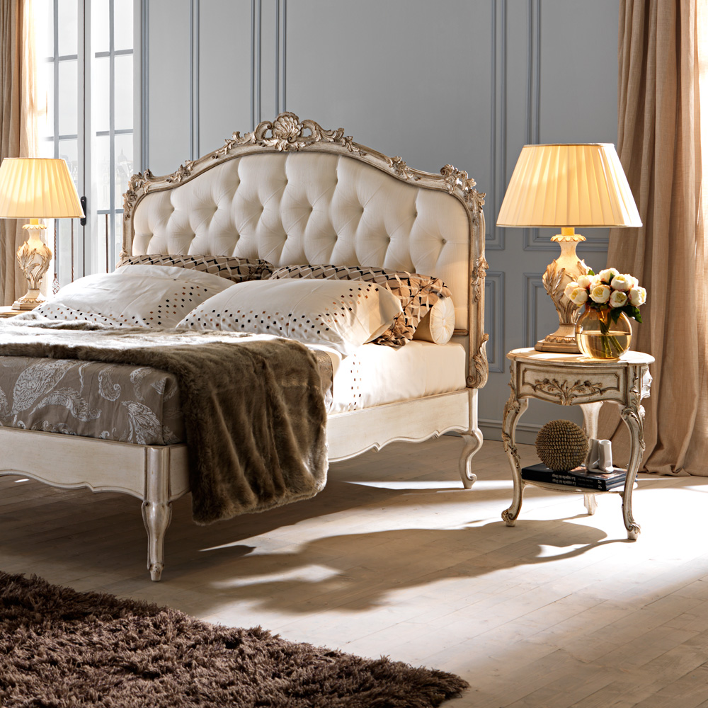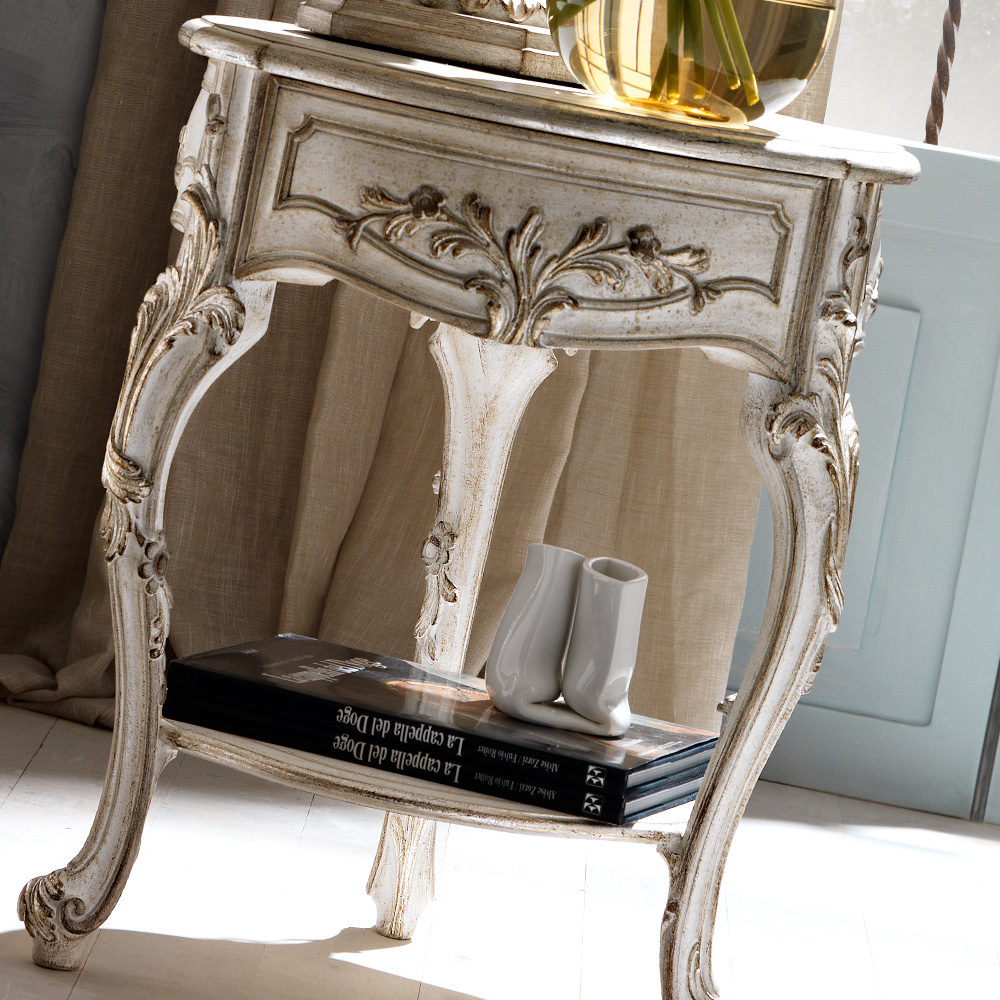 The High End Italian Small Round Bedside Table with hidden drawer and lower shelf. A beautiful addition to any bedroom, also as perfect as a side table by a sofa or in a hallway. Truly versatile. Shown here in an antique white finish together with hand painted antiqued silver and ash to the ornate carvings. Height 63 cm x diameter 50 cm. Alternative frame colours and finishes also available. This bedside table is shown here as part of a bedroom set, also shown. Made to highest standards. Allow 12 weeks for dispatch. The subtle finishes of the unique Florence Collection with every detail designed to be exclusive.