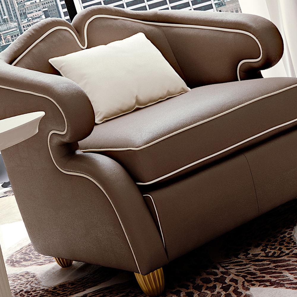 The High End Italian Upholstered Brown Leather Armchair is luxury redefined. Of Art Deco inspiration, a perfect combination of style and high end opulence. This classic design adds sophistication, glamour and unrivalled style and comfort. Sumptuously padded and beautifully upholstered in luxurious soft brown leather, this seductive design features a unique contrasting white leather piping detail, completed with ribbed gold-plated feet for a contemporary edge.