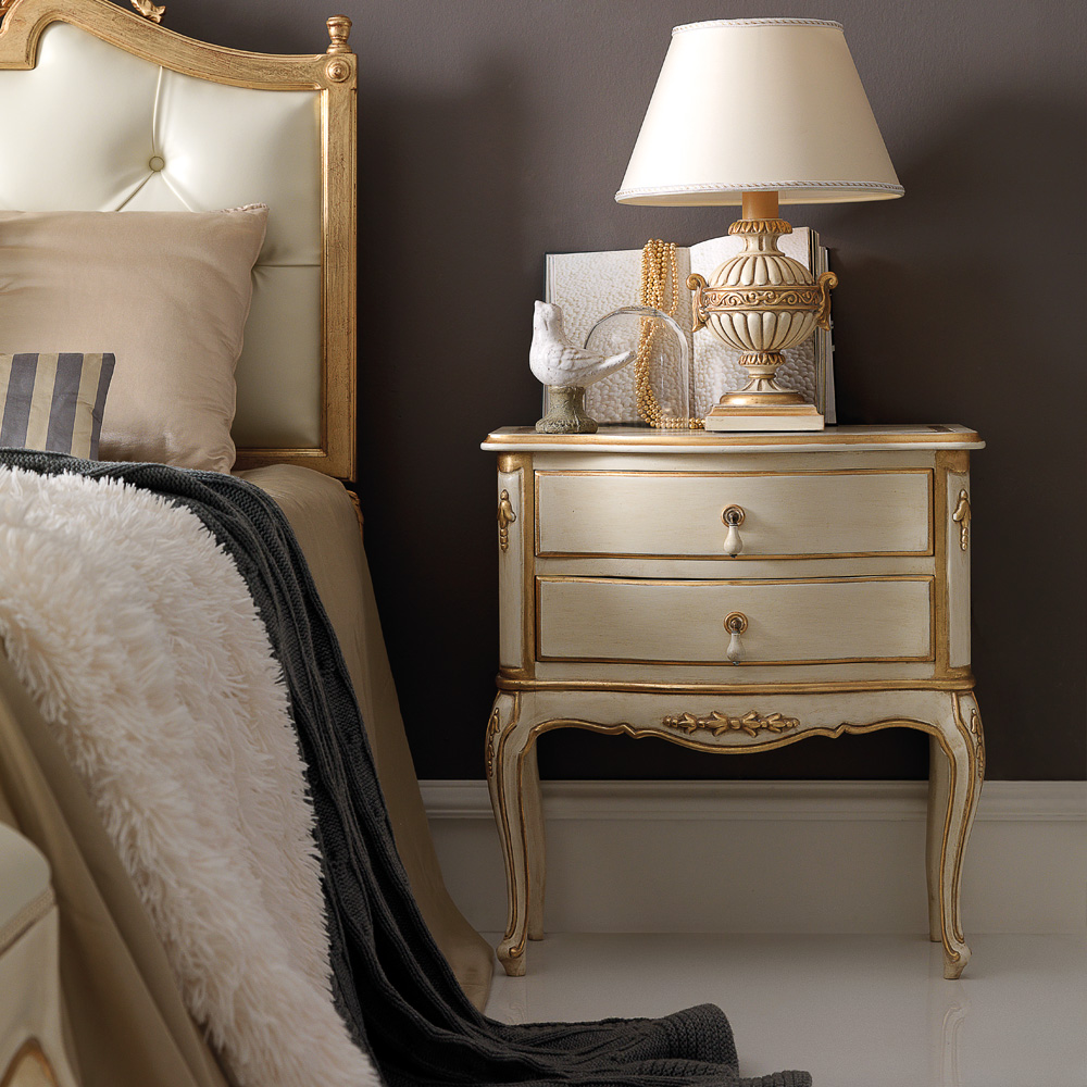The High End Louis Reproduction Bedside Cabinet with 2 drawers and beautiful handle fittings with tear drop ceramic pulls. A beautiful addition to any bedroom. Also as perfect as a side table by a sofa or in a hallway too. Above all, truly versatile. Shown here in an antiqued ivory finish together with hand painted gold detailing to the ornate carved frame details. Height 66 cm x width 62 cm x depth 36 cm. Alternative handle styles, frame colours and finishes are also optional. Prices vary. This bedside table is shown here as part of a bedroom set, also pictured and available. Made to highest standards. Allow 12 weeks for dispatch. The subtle finishes of the unique Florence Collection with every detail designed to be exclusive.
