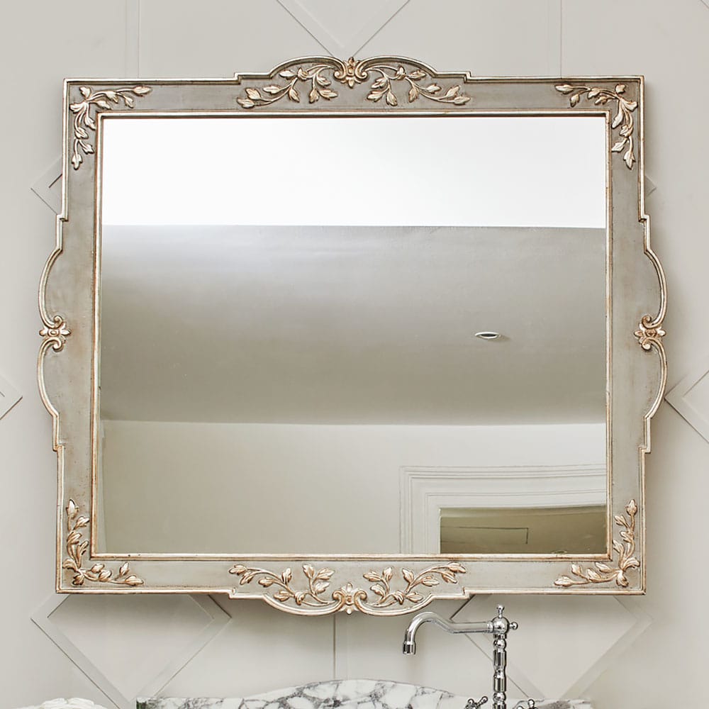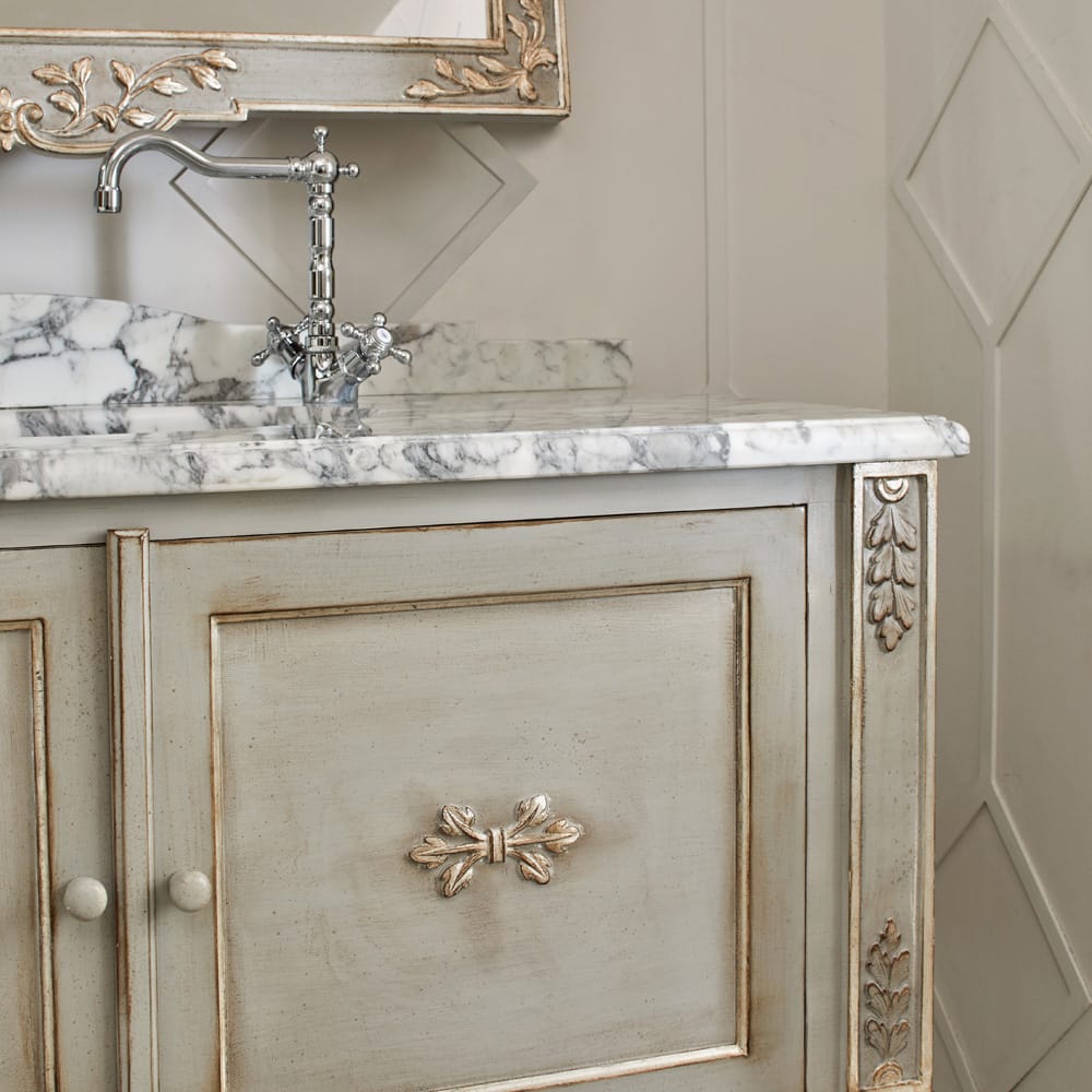 Shown here in an antique-grey with hand-painted accents of silver detailing to the subtle carvings. This beautifully carved cabinet boasts a striking statement Calacatta Arabescato marble top, an elegant defining aspect of this product. The feature taps and fittings are shown here in nickel and complete this design. They are also available in brass.