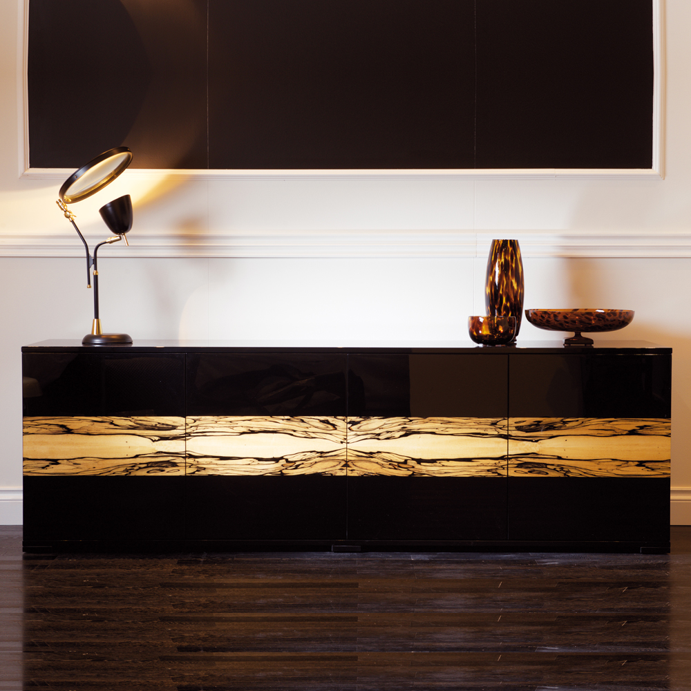 The finest of buffets, offering outstanding sophistication and style. A black lacquered structure of clean lines, in a gloss finish together with a spectacular band of contrasting Albin wood across 4 large push-pull opening doors. Fitted with gloss black lacquered interiors, each door features an internal shelf, offering a truly glamorous storage solution. Feet in a matching gloss black lacquered finish, complete this stunning design. As shown measures height 70 x width 220 x depth 45 cm. This luxurious buffet also comes in a black matt lacquered finish. Prices will vary.