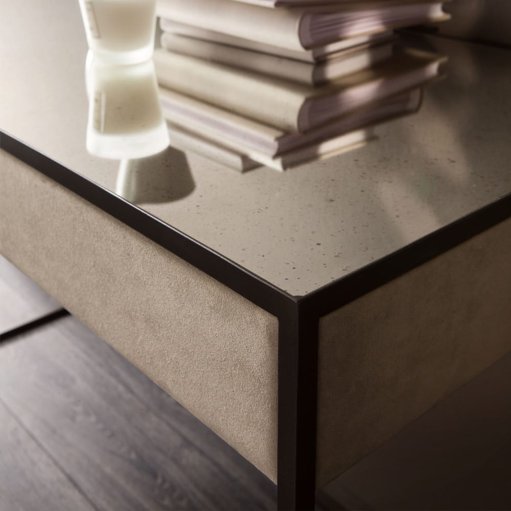 A remarkable iron structure boasting two hidden drawers, beautifully upholstered in the finest on trend taupe faux nubuck leather. The sleek frame in an anthracite iron finish and an inset top in an antiqued bronzed mirror completes this contemporary design. Height 76 cm x width 120 cm x depth 50 cm. Available in alternative luxury finishes such as pale gold, copper, nickel and lacquered, natural mirror and various other faux leathers. Bespoke sizes available by request. Prices will vary.